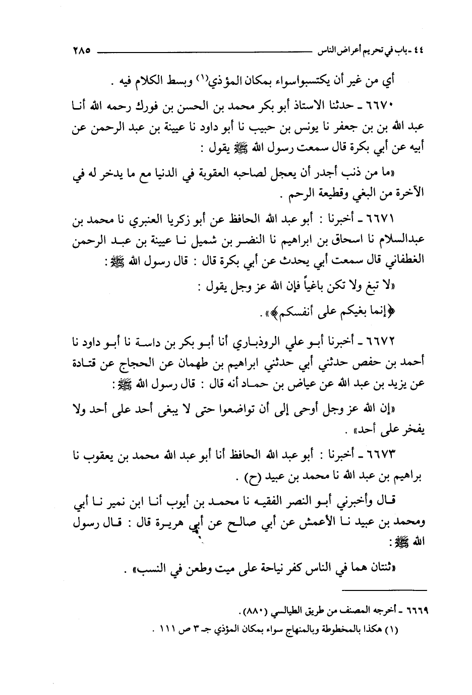 6670 - حدثنا الأستاذ أبو بكر محمد بن الحسن بن فورك رحمه الله أنا عبد الله بن جعفر نا يونس بن حبيب نا أبو داود نا عيينة بن عبد الرحمن عن أبيه عن أبي بكرة قال : سمعت رسول الله صلى الله عليه و سلم يقول :