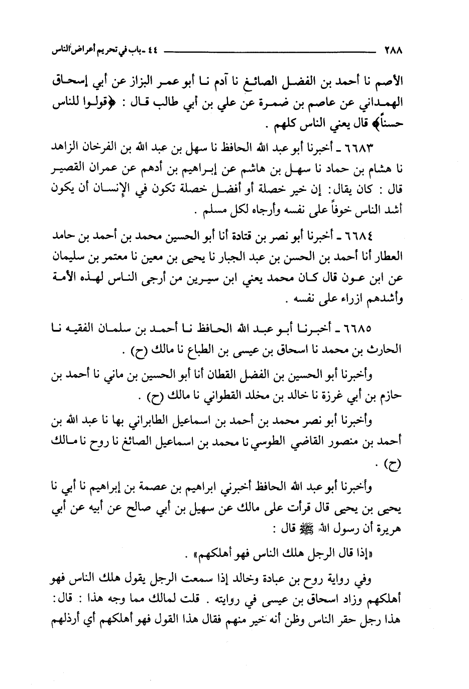 وفي رواية روح بن عبادة و خالد إذا سمعت الرجل يقول هلك الناس فهو أهلكم وزاد إسحاق بن عيسى في روايته قلت لمالك مما وجه هذا : قال : هذا رجل حقر الناس وظن أنه خير منهم فقال هذا القول فهو أهلكم أي أرذلهم وأما رجل حزن لما يرى من النقص في ذهاب الخير فقال هذ القول فإني لأرجو أن لا يكون بأس