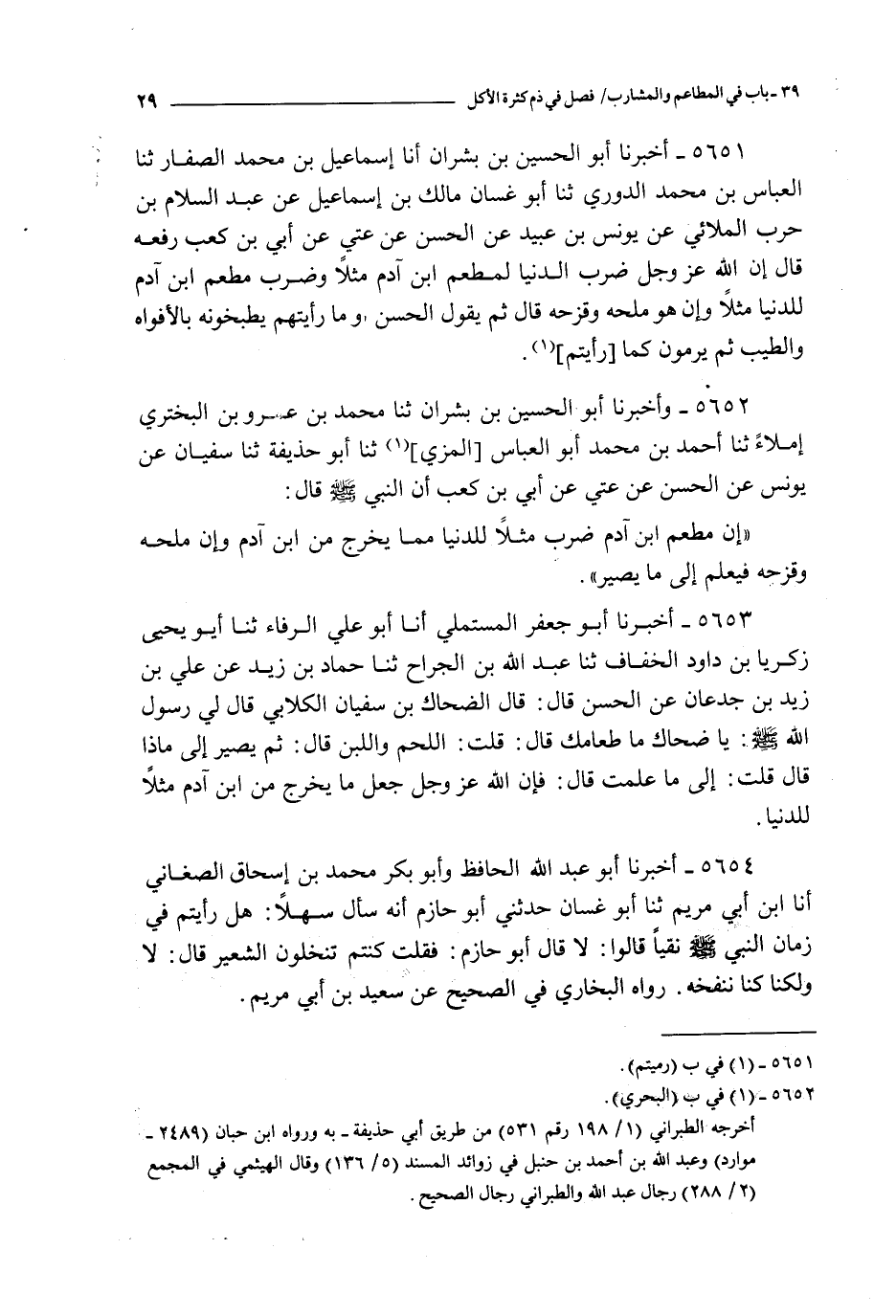 5651 - أخبرنا أبو الحسين بن بشران أنا إسماعيل بن محمد الصفار ثنا العباس بن محمد الدوري ثنا أبو غسان مالك بن إسماعيل عن عبد السلام بن حرب الملائي عن يونس بن عبيد عن الحسن عن عتي عن أبي بن كعب رفعه قال : إن الله عز و جل ضرب الدنيا لمطعم ابن آدم مثلا وضرب مطعم ابن آدم للدنيا مثلا وإن هو ملحه وقزحه ثم يقول الحسن وما رأيتهم يطبخونه بالأفواه والطيب ثم يرمون كما رأيتم