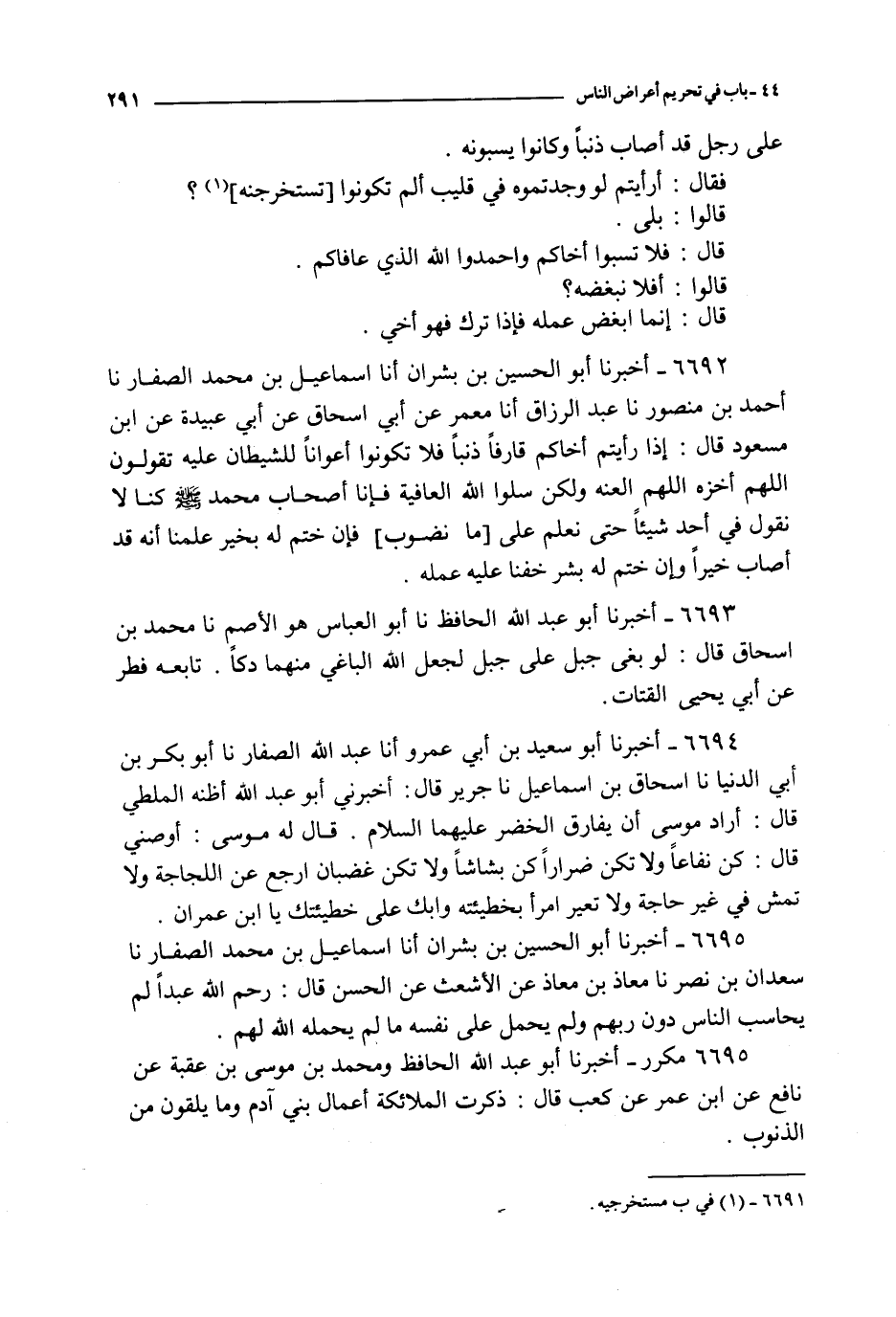 6692 - أخبرنا أبو الحسين بن بشران أنا إسماعيل بن محمد الصفار نا أحمد بن منصور نا عبد الرزاق أنا معمر عن أبي إسحاق عن أبي عبيدة عن ابن مسعود قال : إذا رأيتم أخاكم قارفا ذنبا فلا تكونوا أعوانا للشيطان عليه تقولون اللهم أخزه اللهم العنه ولكن سلوا الله العافية فإنا أصحاب محمد صلى الله عليه و سلم كنا لا نقول في أحد شيئا حتى نعلم ما نضوب فإن ختم له بخير علمنا أنه قد أصاب خيرا وإن ختم له بشر خفنا عليه عمله