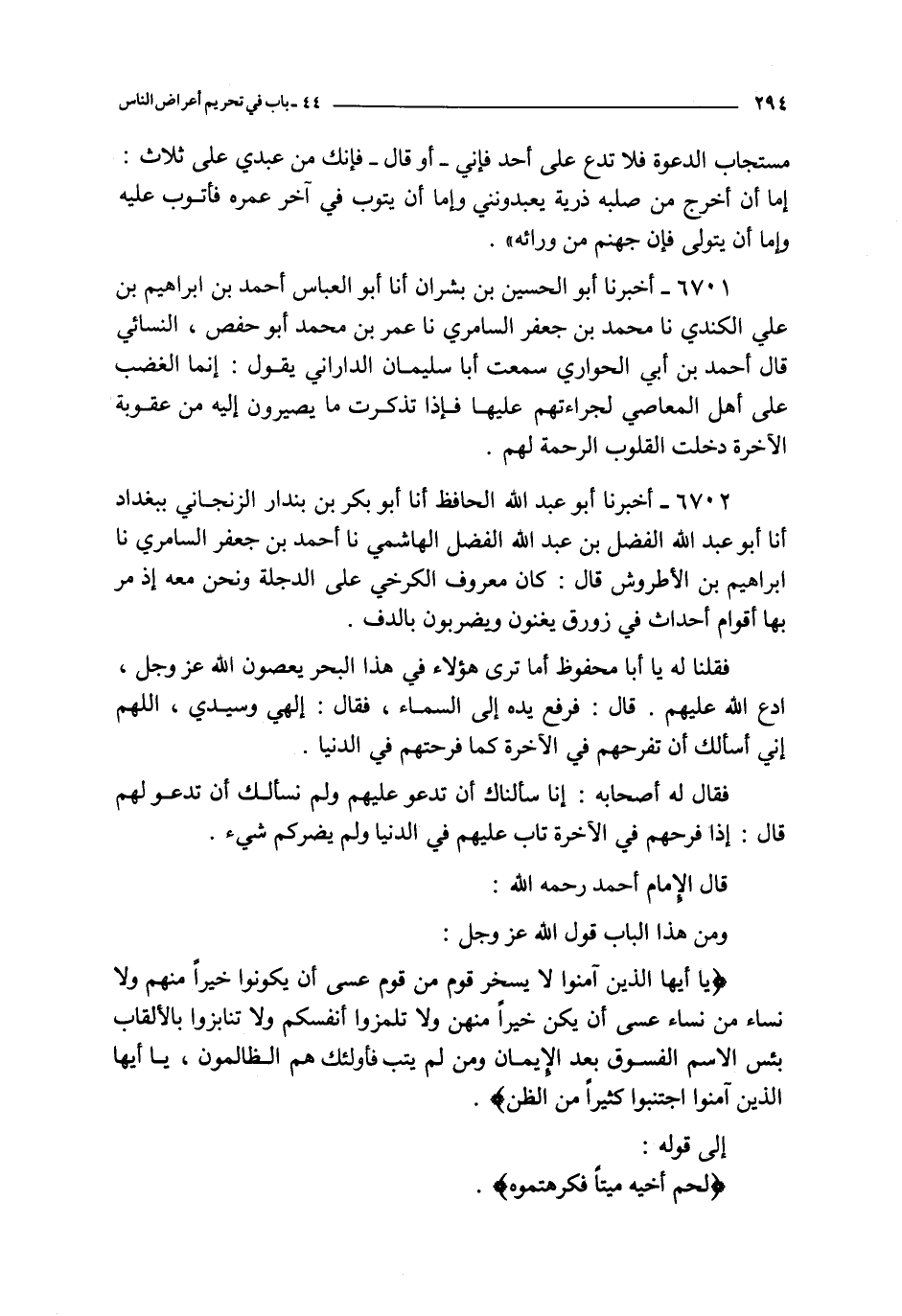 { يا أيها الذين آمنوا لا يسخر قوم من قوم عسى أن يكونوا خيرا منهم ولا نساء من نساء عسى أن يكن خيرا منهن ولا تلمزوا أنفسكم ولا تنابزوا بالألقاب بئس الاسم الفسوق بعد الإيمان ومن لم يتب فأولئك هم الظالمون * يا أيها الذين آمنوا اجتنبوا كثيرا من الظن }