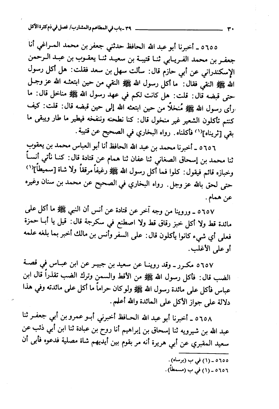 5658 - أخبرنا أبو عبد الله الحافظ أخبرني أبو عمرو بن أبي جعفر ثنا عبد الله بن شيرويه ثنا إسحاق بن إبراهيم أنا روح بن عبادة ثنا ابن أبي ذئب عن سعيد المقبري عن أبي هريرة : أنه مر بقوم بين أيديهم شاة مصلية فدعوه فأبى أن يأكل وقال : خرج رسول الله صلى الله عليه و سلم من الدنيا ولم يشبع من خبز الشعير رواه البخاري في الصحيح عن إسحاق بن إبراهيم