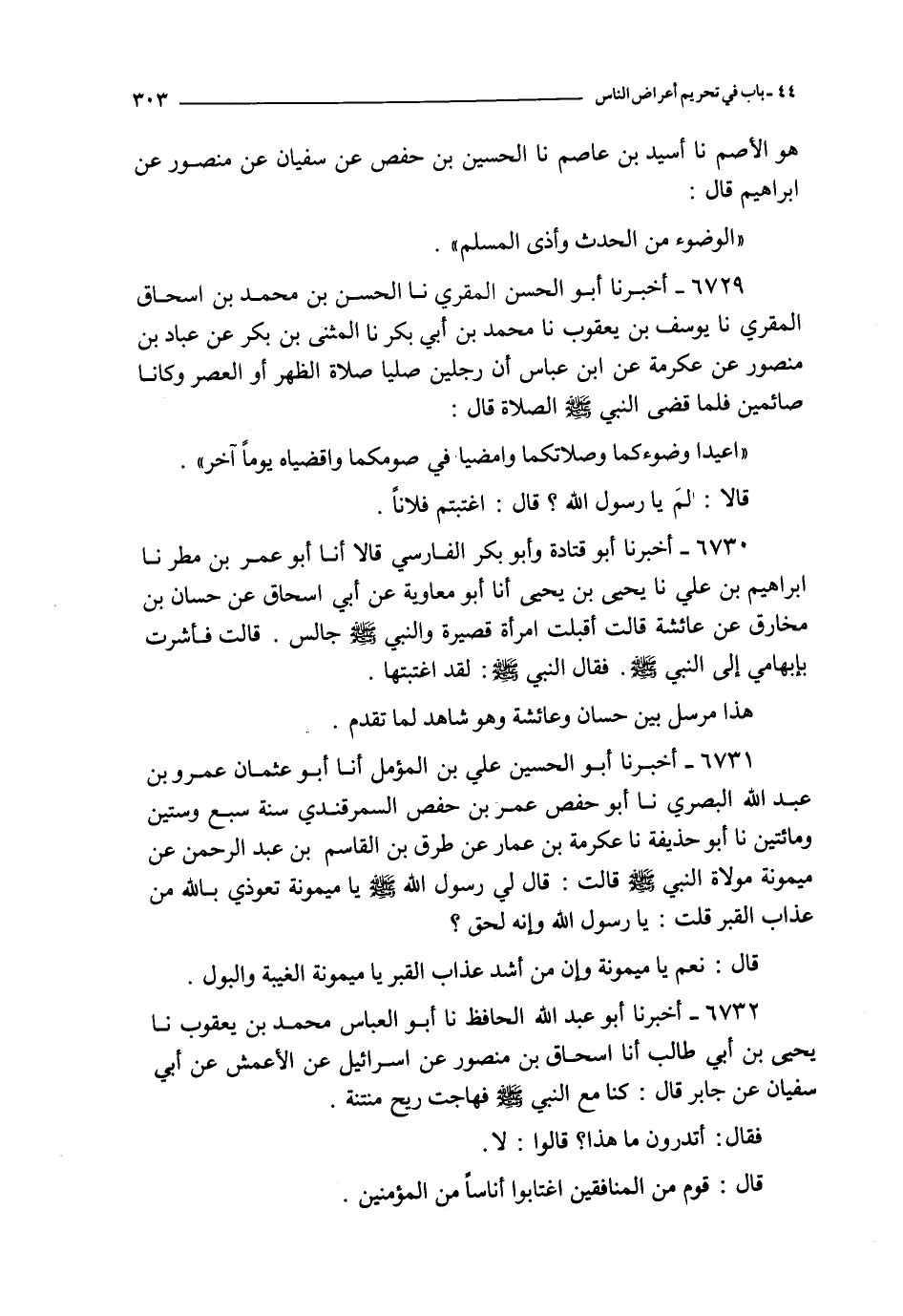 6730 - أخبرنا أبو قتادة و أبو بكر الفارسي قالا أنا أبو عمر بن مطر نا إبراهيم بن علي نا يحيى بن يحيى أنا أبو معاوية عن أبي إسحاق عن حسان بن مخارق عن عائشة قالت : أقبلت امرأة قصيرة والنبي صلى الله عليه و سلم جالس قال فأشرت بإبهامي إلى النبي صلى الله عليه و سلم فقال النبي صلى الله عليه و سلم : لقد اغتبتها