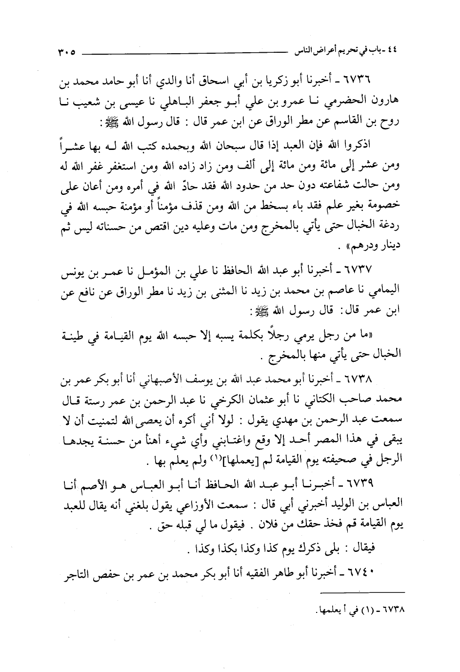 6736 - أخبرنا أبو زكريا بن أبي إسحاق أنا والدي أنا أبو حامد محمد بن هارون الحضرمي نا عمرو بن علي أبو جعفر الباهلي نا عيسى بن شعيب أنا روح بن القاسم عن مطر الوراق عن ابن عمر قال : قال رسول الله صلى الله عليه و سلم :