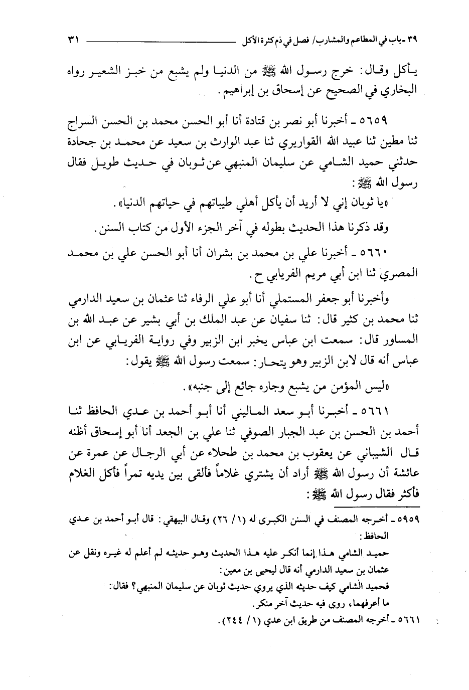 5661 - أخبرنا أبو سعد الماليني أنا أبو أحمد بن عدي الحافظ ثنا أحمد بن الحسن بن عبد الجبار الصوفي ثنا علي بن الجعد أنا أبو إسحاق أظنه قال الشيباني عن يعقوب بن محمد بن طحلاء عن أبي الرجال عن عمرة عن عائشة : أن رسول الله صلى الله عليه و سلم أراد أن يشتري غلاما فألقى بين يديه تمرا فأكل الغلام فأكثر فقال رسول الله صلى الله عليه و سلم : إن كثرة الأكل شؤم وأمر برده