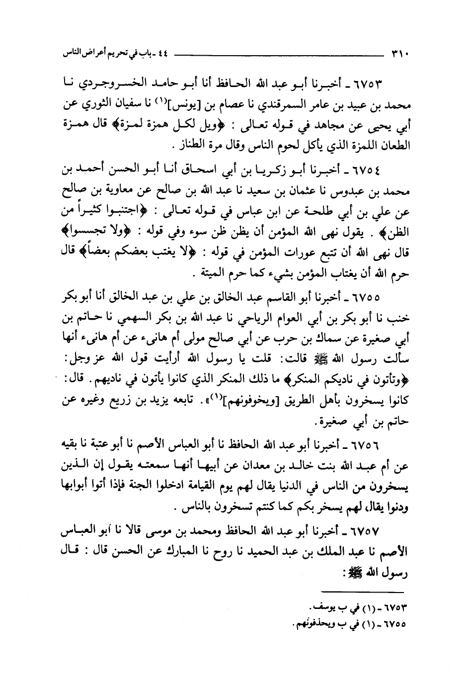 6754 - أخبرنا أبو زكريا بن أبي إسحاق أنا أبو الحسن أحمد بن محمد بن عبدوس نا عثمان بن سعيد نا عبد الله بن صالح عن معاوية بن صالح عن علي بن أبي طلحة عن ابن عباس في : قوله تعالى : { اجتنبوا كثيرا من الظن } يقول نهى الله المؤمن أن يظن ظن سوء وفي قوله { ولا تجسسوا } قال نهى الله أن تتبع عورات المؤمن في قوله { لا يغتب بعضكم بعضا } قال حرم الله أن يغتاب المؤمن بشيء كما حرم الميتة