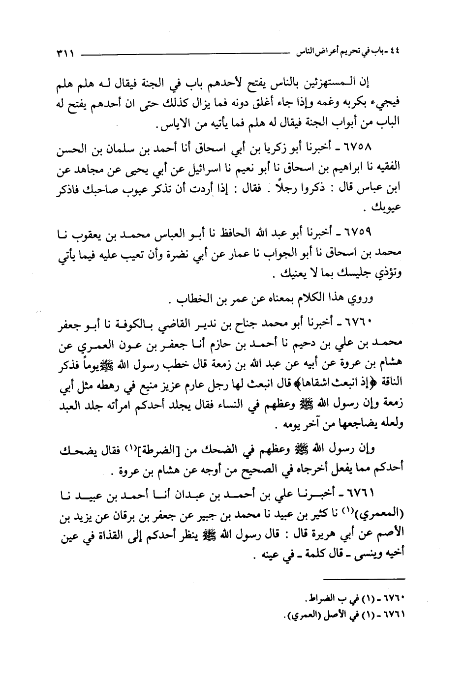 6759 - أخبرنا أبو عبد الله الحافظ نا أبو العباس محمد بن يعقوب نا محمد بن إسحاق نا أبو الجواب نا عمار عن أبي نضرة : وأن تعيب عليه فيما يأتي وتؤذي جليسك بما لا يعيبك