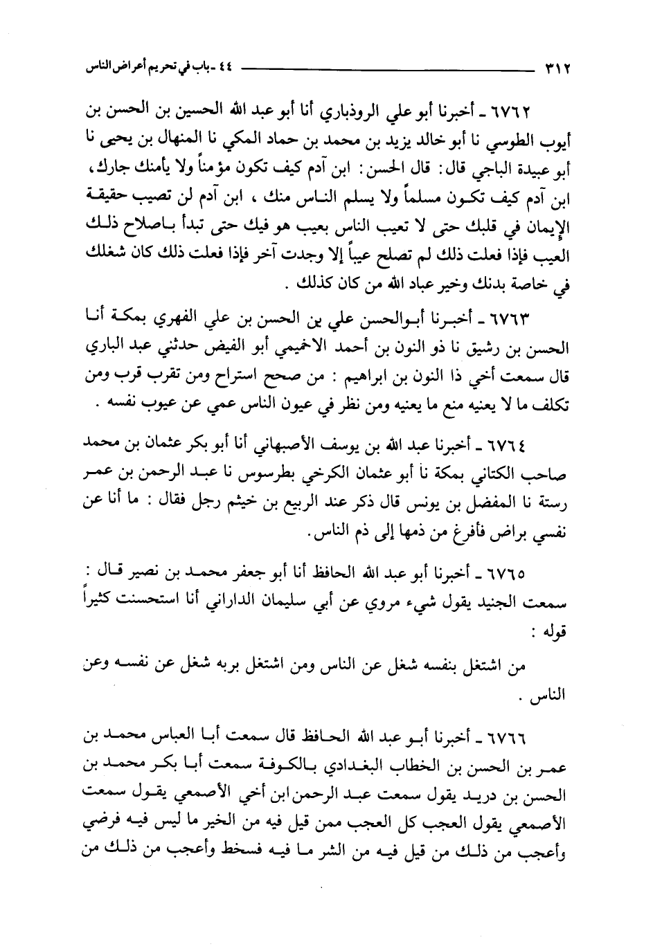 6765 - أخبرنا أبو عبد الله الحافظ أنا أبو جعفر محمد بن نصير قال : سمعت الجنيد يقول شيء مروي عن أبي سليمان الداراني أنا استحسنت كثيرا قوله : من اشتغل بنفسه شغل عن الناس ومن اشتغل بربه شغل عن نفسه وعن الناس