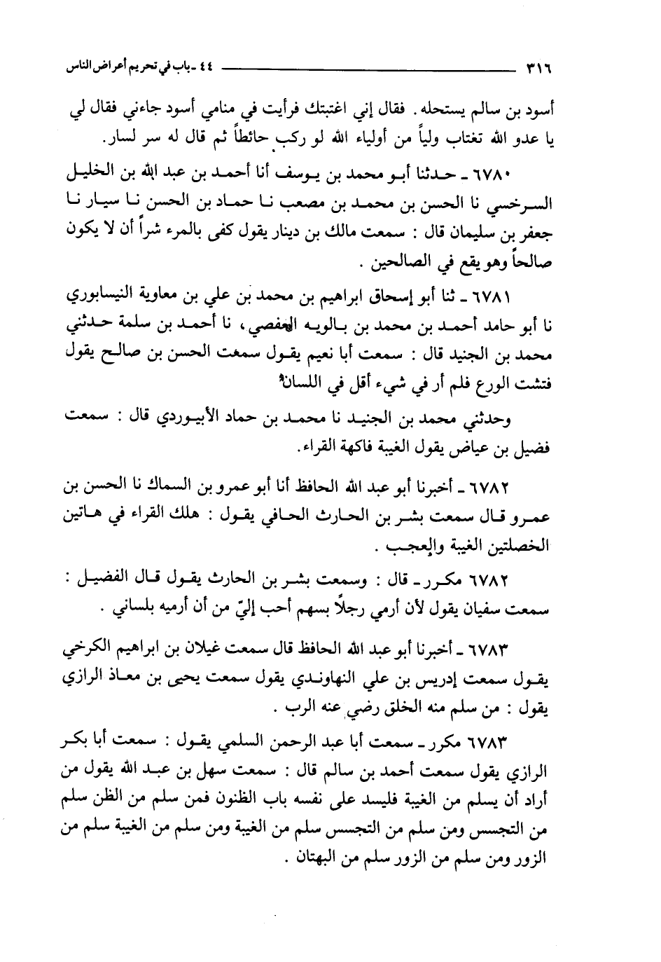 6783 - مكرر ـ سمعت أبا عبد الرحمن السلمي يقول : سمعت أبا بكر الرازي يقول سمعت أحمد بن سالم قال : سمعت سهل بن عبد الله يقول : من أراد أن يسلم من الغيبة فليسد على نفسه باب الظنون فمن سلم من الظن سلم من التجسس ومن سلم من التجسس سلم من الغيبة ومن سلم من الغيبة سلم من الزور ومن سلم من الزور سلم من البهتان