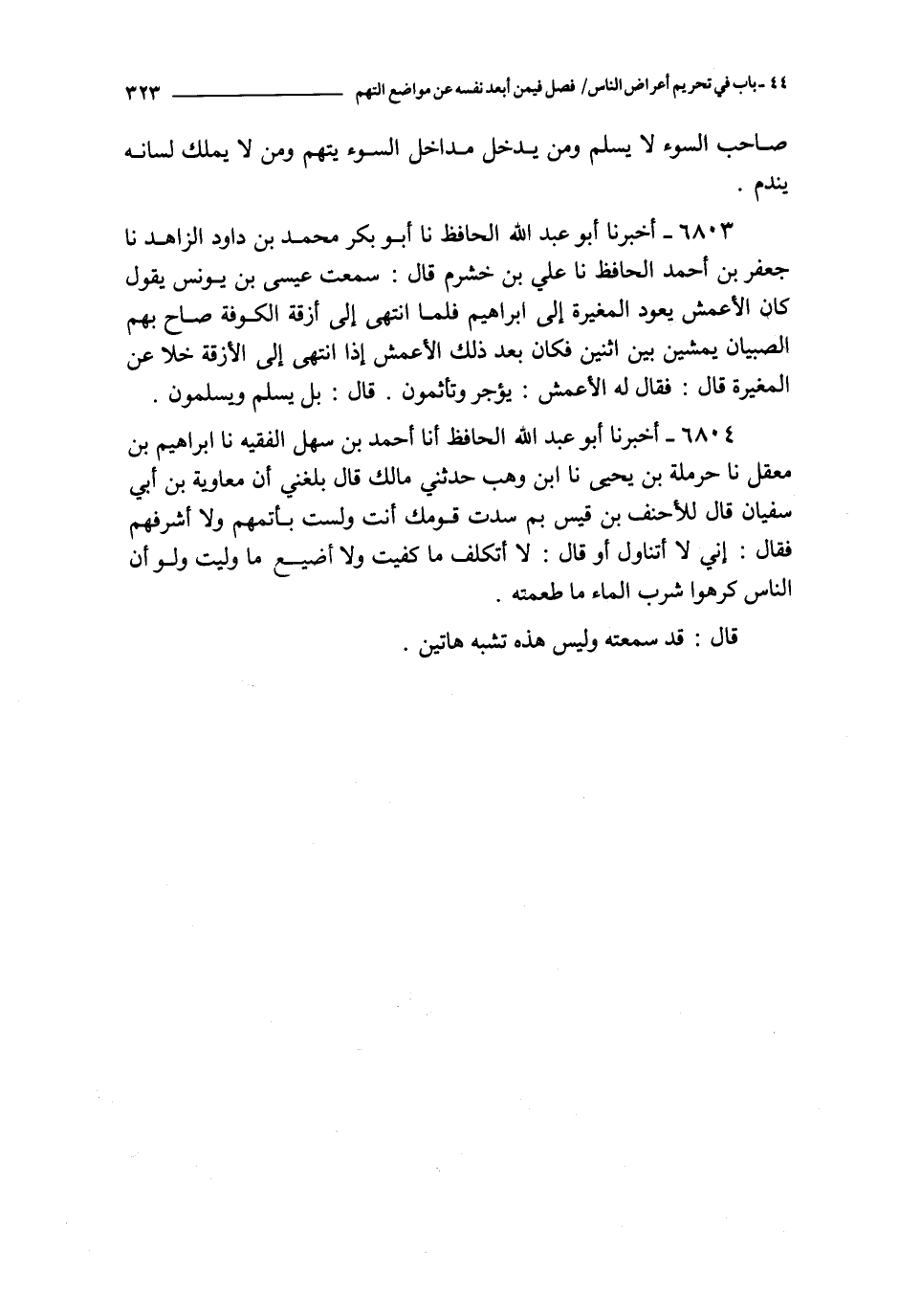 6803 - أخبرنا أبو عبد الله الحافظ نا أبو بكر محمد بن داود الزاهد نا جعفر بن أحمد الحافظ نا علي بن خشرم قال : سمعت عيسى بن يونس يقول : كان الأعمش يعود المغيرة إلى إبراهيم فلما انتهى إلى أزقة الكوفة صاح بهم الصبيان يمشين بين اثنين فكان بعد ذلك الأعمش إذا انتهى إلى الأزقة خلا عن المغيرة قال : فقال له الأعمش : يؤجر وتأثمون قال : بل يسلم و يسلمون