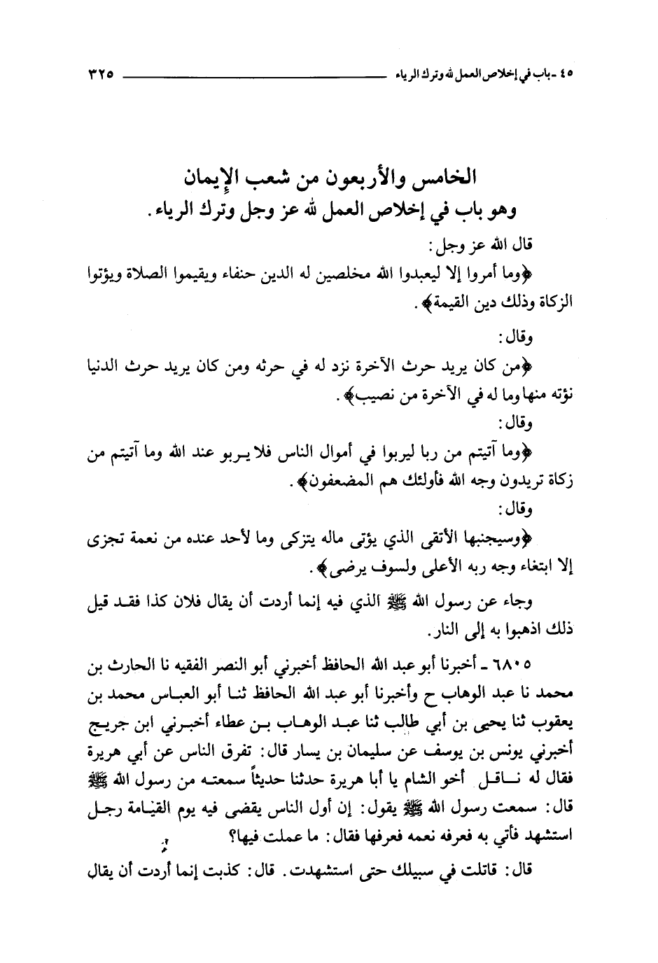 الخامس و الأربعون من شعب الإيمان وهو باب في إخلاص العمل لله عز و جل وترك الرياء قال الله عز و جل : { وما أمروا إلا ليعبدوا الله مخلصين له الدين حنفاء ويقيموا الصلاة ويؤتوا الزكاة وذلك دين القيمة } وقال : { من كان يريد حرث الآخرة نزد له في حرثه ومن كان يريد حرث الدنيا نؤته منها وما له في الآخرة من نصيب } وقال : { وما آتيتم من ربا ليربو في أموال الناس فلا يربو عند الله وما آتيتم من زكاة تريدون وجه الله فأولئك هم المضعفون } وقال : { وسيجنبها الأتقى * الذي يؤتي ماله يتزكى * وما لأحد عنده من نعمة تجزى * إلا ابتغاء وجه ربه الأعلى * ولسوف يرضى } وجاء عن رسول الله صلى الله عليه و سلم الذي فيه إنما أردت أن يقال فلان كذا قصد قيل ذلك اذهبوا به إلى النار