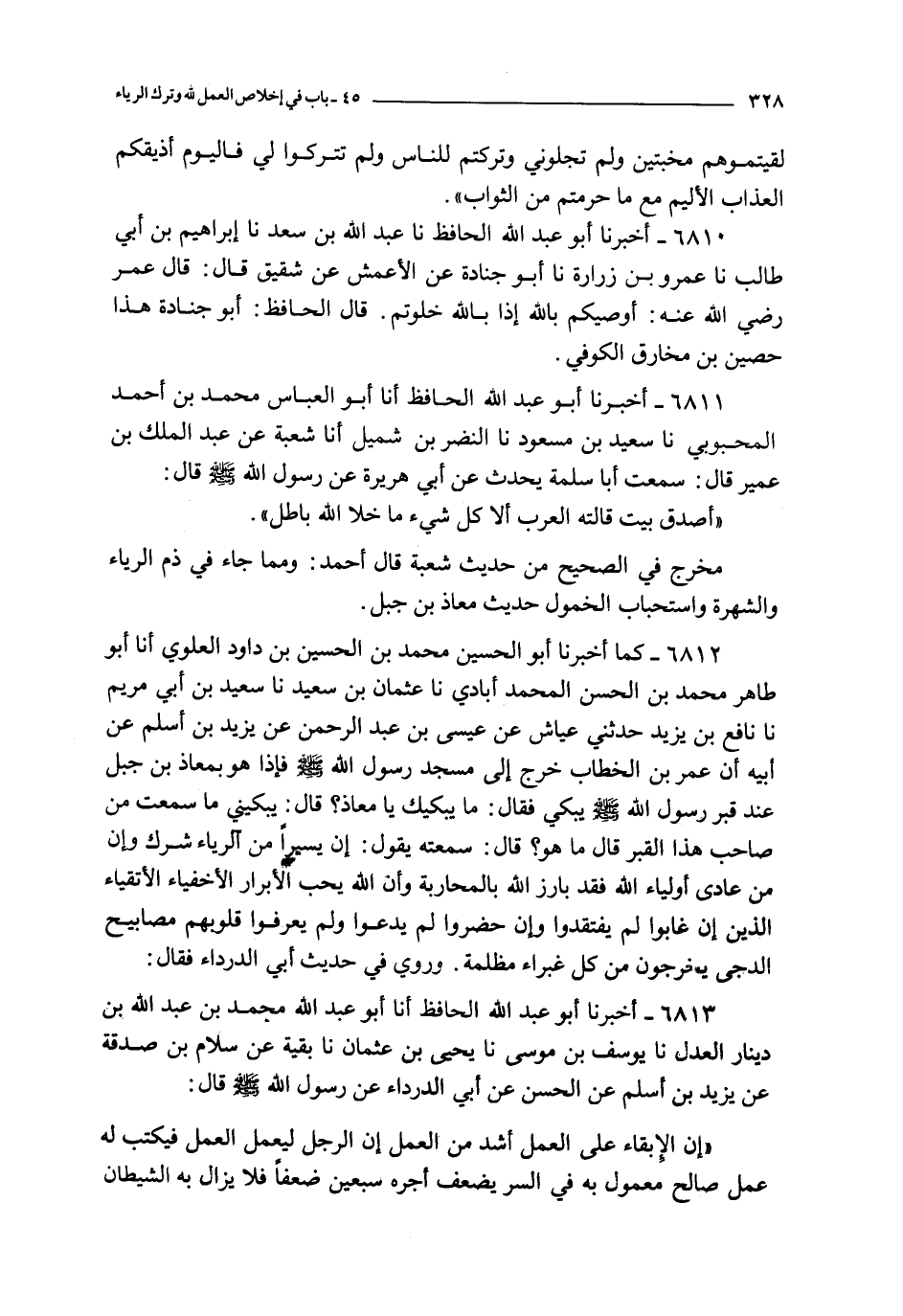 6812 - كما أخبرنا أبو الحسين محمد بن الحسين بن داود العلوي أنا أبو طاهر محمد بن الحسن المحمد أبادي نا عثمان بن سعيد نا سعيد بن أبي مريم نا نافع بن يزيد حدثني عياش عن عيسى بن عبد الرحمن عن يزيد بن أسلم عن أبيه : أن عمر بن الخطاب خرج إلى مسجد رسول الله صلى الله عليه و سلم فإذا هو بمعاذ بن جبل عند قبر رسول الله صلى الله عليه و سلم يبكي فقال : ما يبكيك يا معاذ ؟ قال : يبكيني ما سمعت من صاحب هذا القبر قال ما هو ؟ قال : سمعته يقول : إن يسيرا من الرياء شرك وإن من عادى أولياء الله فقد بارز الله بالمحاربة وأن الله يحب الإبرار الأخفياء الأتقياء الذين إن غابوا لم يفتقدوا وإن حضروا لم يدعوا ولم يعرفوا قلوبهم مصابيح الدجى يخرجون من كل غبراء مظلمة وروي في حديث أبي الدرداء فقال
