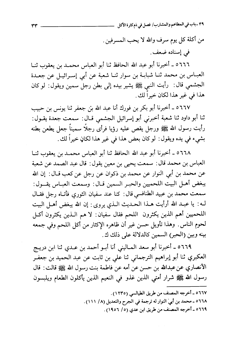 5668 - أخبرنا أبو عبد الله الحافظ ثنا أبو العباس محمد بن يعقوب ثنا العباس بن محمد قال : سمعت يحيى بن معين يقول : قال عبد الصمد عن شعبة عن محمد بن أبي النوار عن محمد بن ذكوان عن رجل عن كعب قال : إن الله يبغض أهل البيت اللحميين والحبر السمين قال : وسمعت العباس يقول : سمعت محمد بن عبيد الطنافسي قال : كنا عند سفيان الثوري فأتاه رجل فقال له : يا عبد الله أرأيت هذا الحديث الذي يروي : إن الله يبغض أهل البيت اللحميين أهم الذين يكثرون اللحم فقال سفيان : لا هم الذين يكثرون لحوم الناس وهذا تأويل حسن غير أن ظاهره الإكثار من أكل اللحم وفي جمعه بينه وبين الحبر السمين كالدلالة على ذلك ك