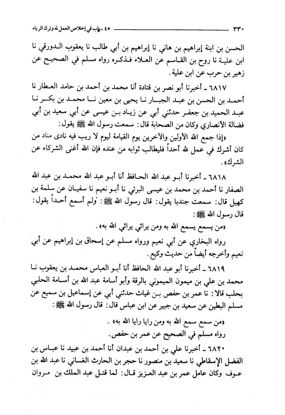 6820 - أخبرنا علي بن أحمد بن عبدان أنا أحمد بن عبيد نا عباس بن الفضل الأسقاطي نا سعيد بن منصور نا حجر بن الحارث الغساني نا عبد الله بن عوف وكان عامل عمر بن عبد العزيز قال : لما قتل عبد الملك بن مروان عمرو بن سعيد بن العاص قال : بشر بن عقربة يا أبا اليمان قد احتجت إلى كلامك فقم فتكلم قال : إني سمعت رسول الله صلى الله عليه و سلم : من وقف موقف رياء وسمعة وقفه الله يوم القيامة موقف رياء وسمعة وقال : عن سعيد بن منصور عن بشر بن عقربة