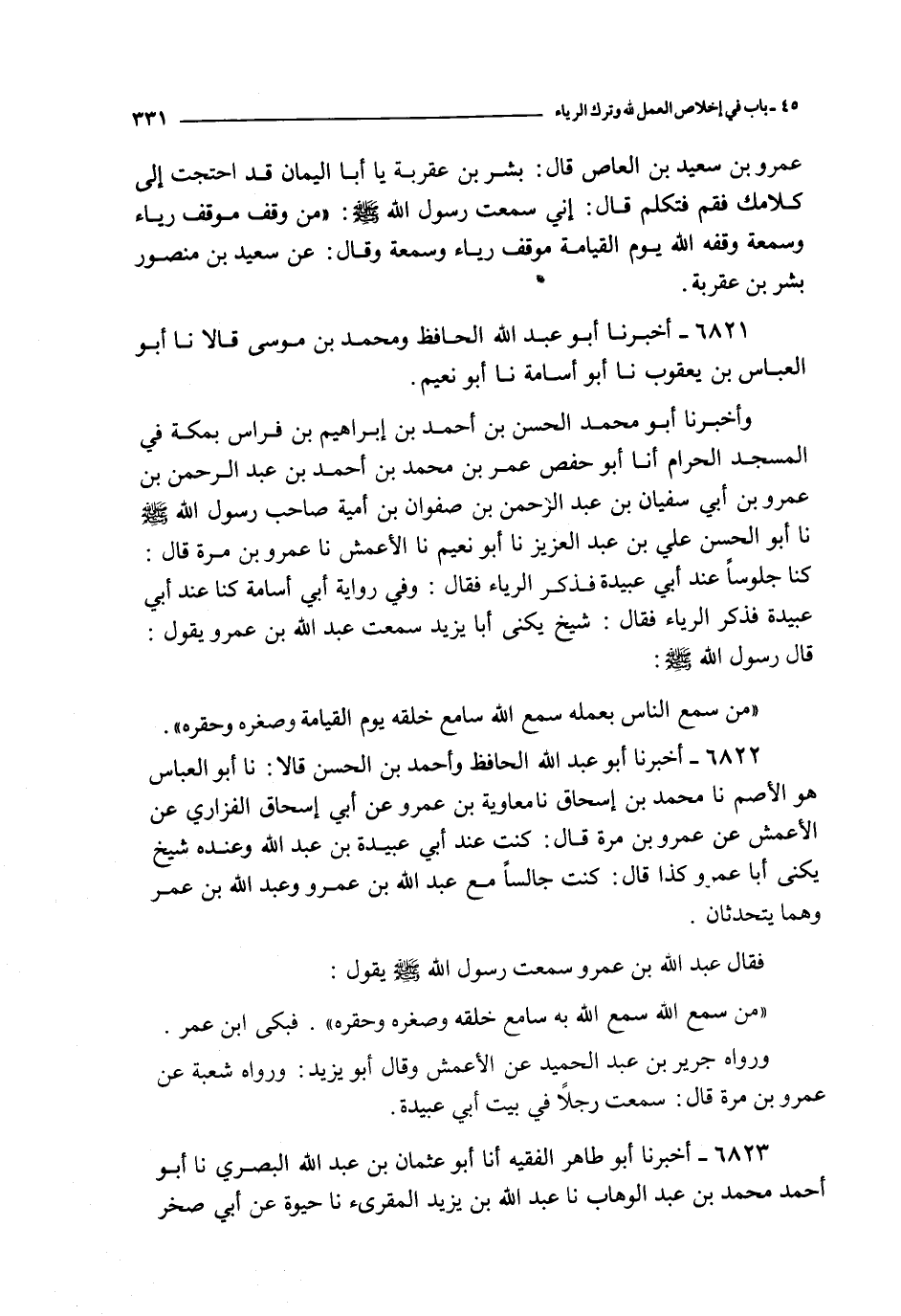 وأخبرنا أبو محمد الحسن بن أحمد بن إبراهيم بن فراس بمكة في المسجد الحرام أنا أبو حفص عمر بن محمد بن أحمد بن عبد الرحمن بن عمرو بن أبي سفيان بن عبد الرحمن بن صفوان بن أمية صاحب رسول الله صلى الله عليه و سلم نا أبو الحسن علي بن عبد العزيز نا أبو نعيم نا الأعمش نا عمرو بن مرة قال : كنا جلوسا عند أبي عبيدة فذكر الرياء فقال : وفي رواية أبي أسامة كنا عند أبي عبيدة فذكر الرياء فقال : شيخ يكنة أبا يزيد سمعت عبد الله بن عمرو يقول : قال رسول الله صلى الله عليه و سلم :