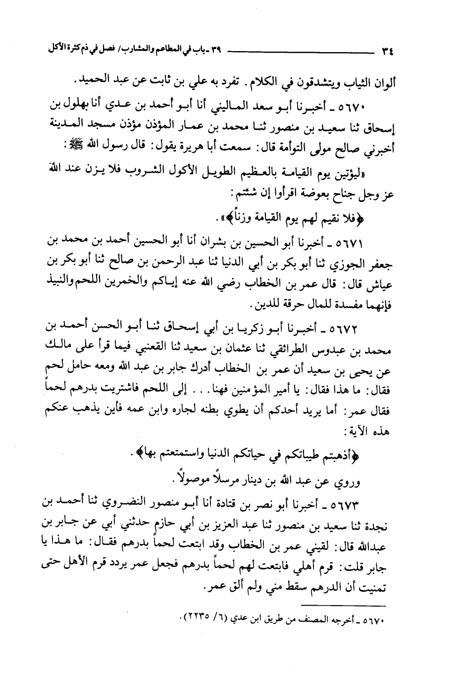 5672 - أخبرنا أبو زكريا بن أبي إسحاق ثنا أبو الحسن أحمد بن محمد بن عبدوس الطرائقي ثنا عثمان بن سعيد ثنا القعنبي فيما قرأ على مالك عن يحيى بن سعيد : أن عمر بن الخطاب أدرك جابر بن عبد الله ومعه حامل لحم فقال : ما هذا فقال : يا أمير المؤمنين فهنا إلى اللحم فاشتريت بدرهم لحما فقال عمر : أما يريد أحدكم أن يطوي بطنه لجاره وابن عمه فأين يذهب عنكم هذه الآية :