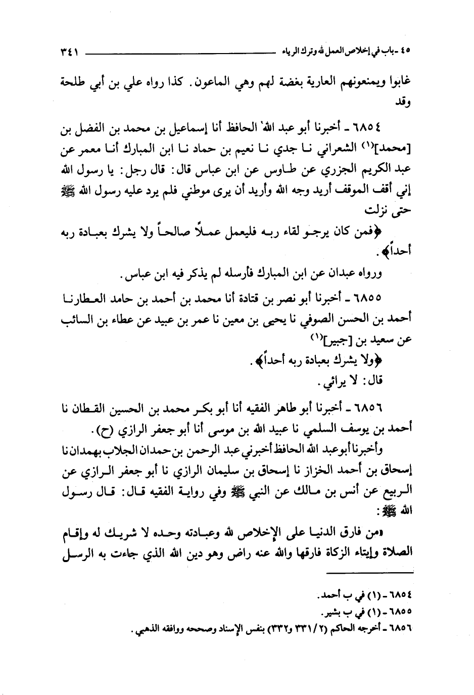6854 - أخبرنا أبو عبد الله الحافظ أنا إسماعيل بن محمد بن الفضل بن محمد الشعراني نا جدي نا نعيم بن حماد نا ابن المبارك أنا معمر عن عبد الكريم الجزري عن طاوس عن ابن عباس قال : قال رجل : يا رسول الله إني أقف الموقف أريد وجه الله وأريد أن يرى موطني فلم يرد عليه رسول الله صلى الله عليه و سلم حتى نزلت