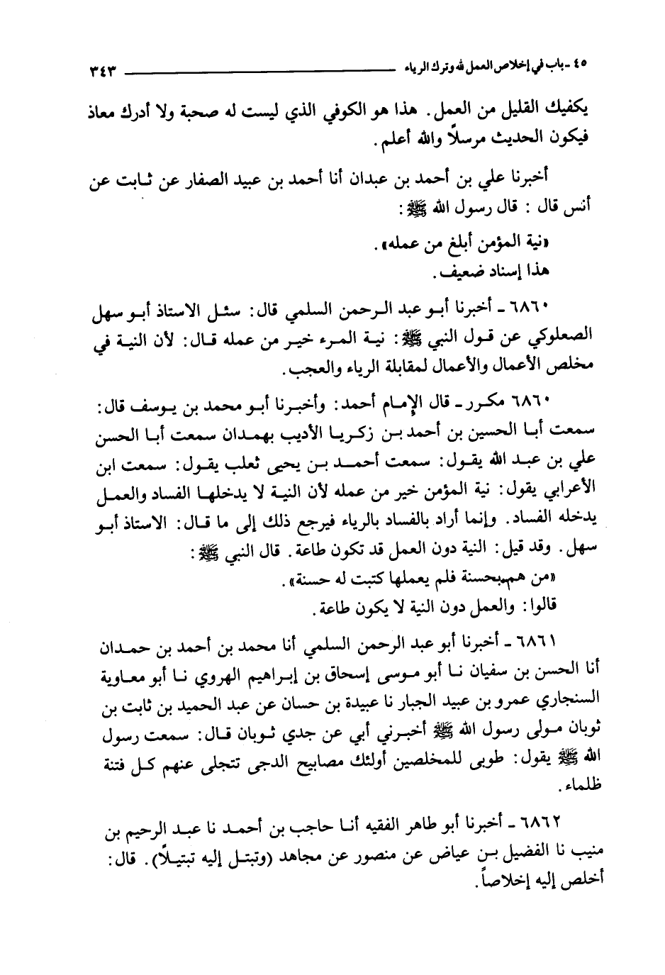 6860 - مكرر ـ قال الإمام أحمد : وأخبرنا أبو محمد بن يوسف قال : سمعت أبا الحسين بن أحمد بن زكريا الأديب بهمدان سمعت أبا الحسن علي بن عبد الله يقول : سمعت أحمد بن يحيى ثعلب يقول : سمعت ابن الأعرابي يقول : نية المؤمن خير من عمله لأن النية لا يدخلها الفساد والعمل يدخله الفساد وإنما أراد بالفساد بالرياء فيرجع ذلك إلى ما قال : الاستاذ أبو سهل وقد قيل : النية دون العمل قد تكون طاعة قال النبي صلى الله عليه و سلم :