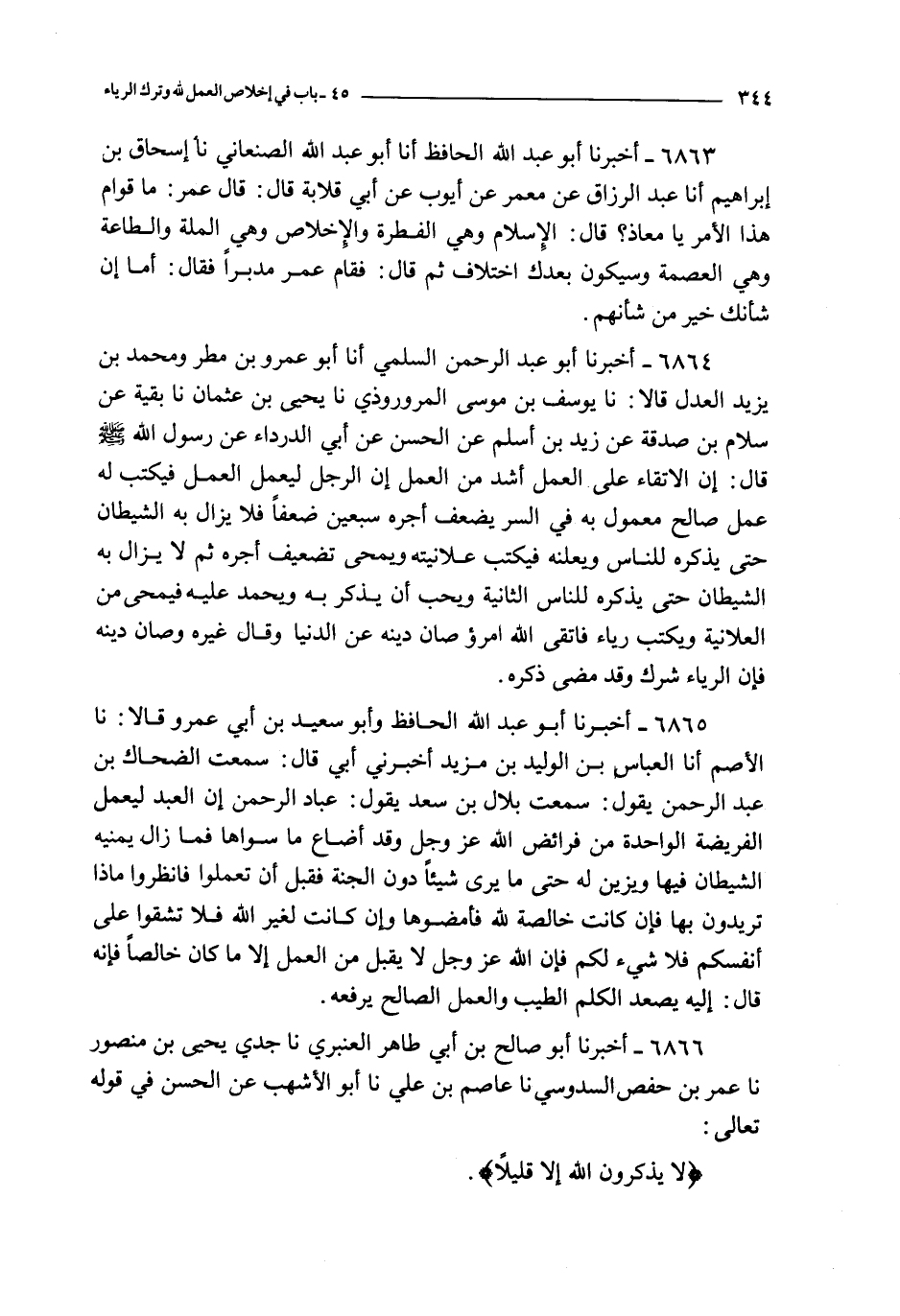 6864 - أخبرنا أبو عبد الرحمن السلمي أنا أبو عمرو بن مطر و محمد بن يزيد العدل قالا : نا يوسف بن موسى المروروذي نا يحيى بن عثمان نا بقية عن سلام بن صدقة عن زيد بن أسلم عن الحسن عن أبي الدرداء : عن رسول الله صلى الله عليه و سلم قال : إن الاتقاء على العمل أشد من العمل إن الرجل ليعمل العمل فيكتب له عمل صالح معمول به في السر يضعف أجره سبعين ضعفا فلا يزال به الشيطان حتى يذكره للناس الثنية ويحب أن يذكر به ويحمد عليه فيمحي من العلانية ويكتب رياء فاتقى الله امرؤ صان دينه عن الدنيا وقال غيره وصان دينه فإن الرياء شرك وقد مضى ذكره