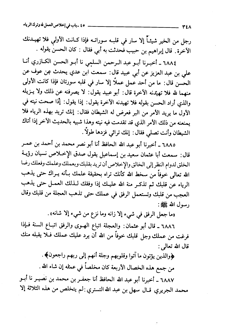 6887 - أخبرنا أبو عبد الله الحافظ أنا جعفر بن محمد بن نصير نا أبو محمد الجريري قال سهل بن عبد الله التستري : لم يتخلص من هذه الثلاثة إلا صديق : العجب والذكر والدعوى ولم يتخلص منها إلا عرف نعم الله عليه في مسالك الروح وعرف تقصيره في أداء الشكر فمن كان هكذا سلم قال : وأنا جعفر الخلدي قال : سمعت الخواص يقول : العجلة تمنع من إصابة الحق قال : وأنا جعفر قال : سمعت إبراهيم الخواص يقول : الناس يروني وإما أعمل وإما أتكلف من الشدة وركوب الأمور الصعبة وحملي على نفسي يظنون أني أعمل في رفع الدرجات وإنما أعمل في فكاك رقبتي من الله أو كما قال : وسمعت إبراهيم يقول : لو علم الناس كيفية ذل العارف في نفسه لرجموه بالحجارة ولو عرفوا كيفية عزته عند الله لعبدوه من دون الله