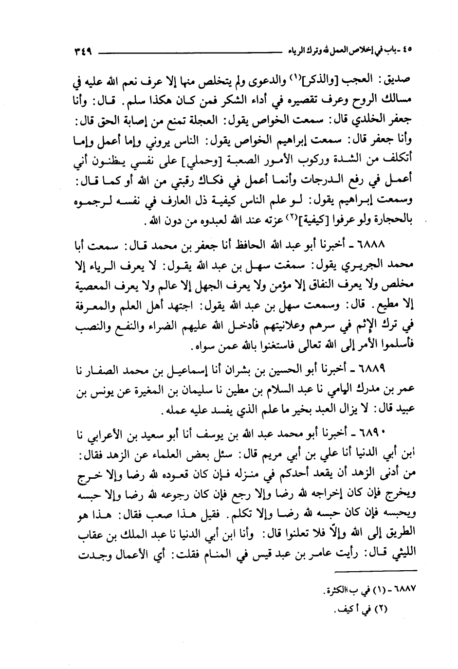 6890 - أخبرنا أبو محمد عبد الله بن يوسف أنا أبو سعيد بن الأعرابي أنا ابن أبي الدنيا أنا علي ابن أبي مريم قال : سئل بعض العلماء عن الزهد فقال : من أدنى الزهد أن يعقد أحدكم في منزله فإن كان قعوده لله رضا وإلا خرج ويخرج فإن كان إخراجه لله رضا وإلا رجع فإن كان رجوعه لله رضا وإلا حسبه ويحسبه فإن كان حسبه لله رضا وإلا تكلم فقيل هذا صعب فقال : هذا هو الطريق إلى الله وإلا فلا تعلنوا قال : وأنا ابن أبي الدنيا نا عبد الملك بن عقاب الليثي قال : رأيت عامر بن عبد قيس في المنام فقلت : أي الأعمال وجدت أفضل ؟ قال : ما أريد به وجه الله عز و جل