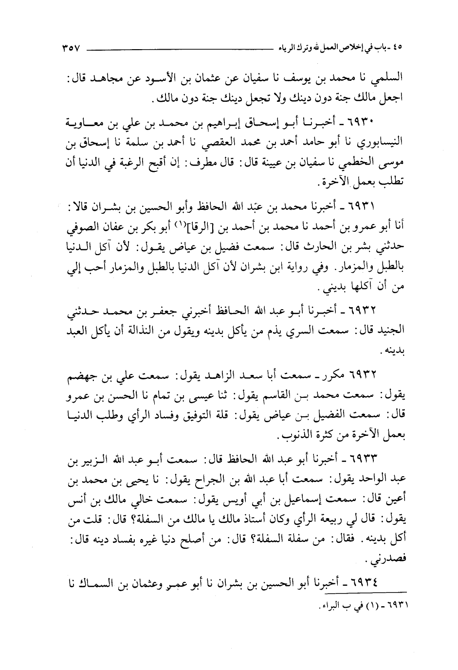 6932 - مكرر ـ سمعت أبا سعد الزاهد يقول : سمعت علي بن جهضم يقول : سمعت محمد بن القاسم يقول : ثنا عيسى بن تمام نا الحسن بن عمرو قال : سمعت الفضيل بن عياض يقول : قلة التوفيق وفساد الرأي وطلب الدنيا بعمل الآخرة من كثرة الذنوب
