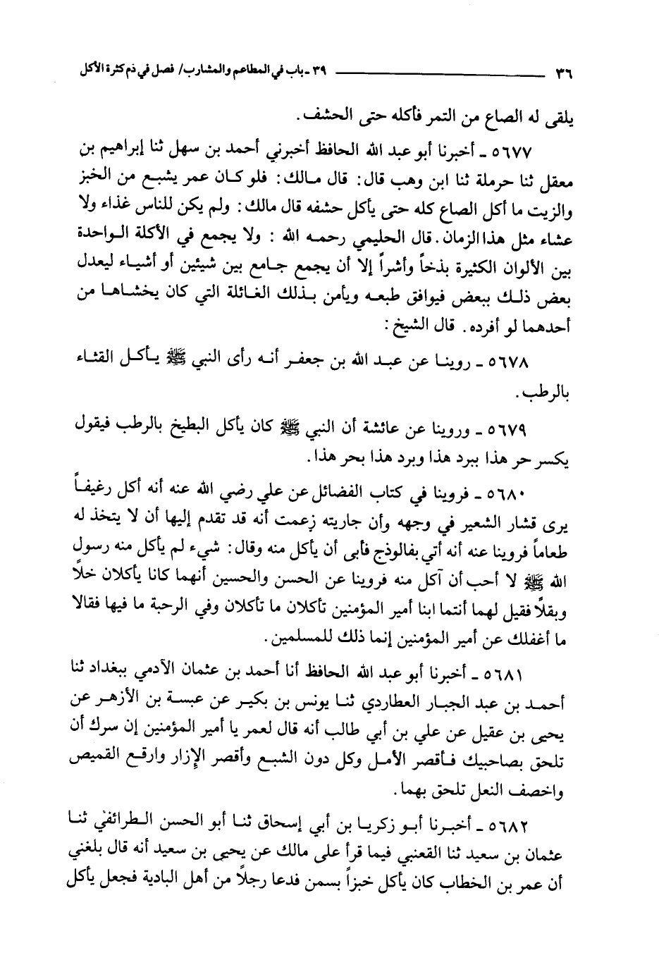 5677 - أخبرنا أبو عبد الله الحافظ أخبرني أحمد بن سهل ثنا إبراهيم بن معقل ثنا حرملة ثنا ابن وهب قال : قال مالك : فلو كان عمر يشبع من الخبز والزيت ما أكل الصاع كله حتى يأكل حشفه قال مالك : ولم يكن الناس غذاء ولا عشاء مثل هذا الزمان قال الحليمي رحمه الله : ولا يجمع في الأكلة الواحدة بين الألوان الكثيرة بذخا وأشرا إلا أن يجمع جامع بين شيئين أو أشياء ليعدل بعض ذلك ببعض فيوافق طبعه ويأمن بذلك الغائلة التي كان يخشاها من أحدهما لو أفرده قال الشيخ