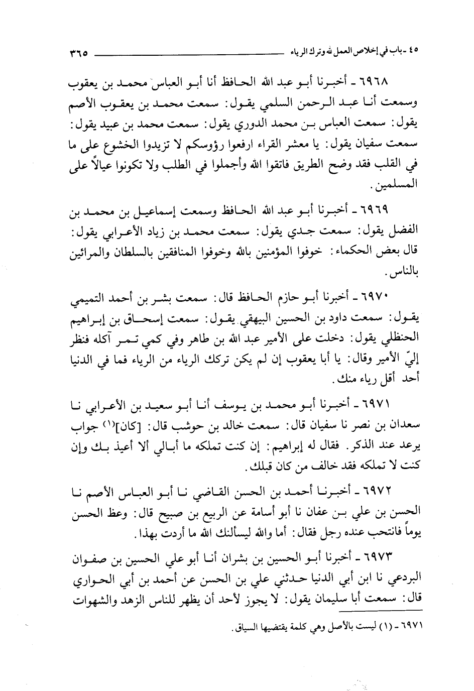 6968 - أخبرنا أبو عبد الله الحافظ أنا أبو العباس محمد بن يعقوب وسمعت أنا عبد الرحمن السلمي يقول : سمعت محمد بن يعقوب الأصم يقول : سمعت العباس بن محمد الدوري يقول : سمعت محمد بن عبيد يقول : سمعت سفيان يقول : يا معشر القراء ارفعوا رؤوسكم لا تزيدوا الخشوع على ما في القلب فقد وضح الطريق فاتقوا الله وأجملوا في الطلب ولا تكونوا عيالا على المسلمين
