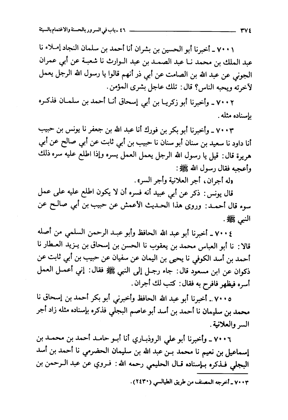 7004 - أخبرنا أبو عبد الله الحافظ و أبو عبد الرحمن السلمي من أصله قالا : نا أبو العباس محمد بن يعقوب نا الحسن بن إسحاق بن يزيد العطار نا أحمد بن أسد الكوفي نا يحيى بن اليمان عن سفيان عن حبيب بن أبي ثابت عن ذكوان عن ابن مسعود قال : جاء رجل إلى النبي صلى الله عليه و سلم فقال : إني أعمل العمل أسره فيظهر فأفرح به فقال : كتب لك أجران