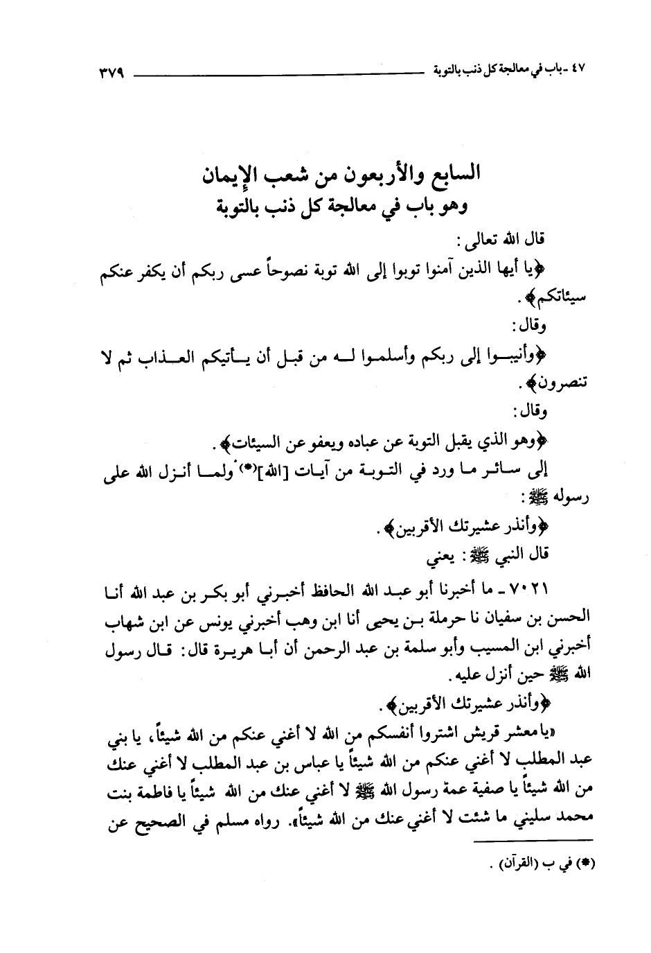 السابع والأربعون من شعب الإيمان وهو باب في معالجة كل ذنب بالتوبة ـ قال الله تعالى : { يا أيها الذين آمنوا توبوا إلى الله توبة نصوحا عسى ربكم أن يكفر عنكم سيئاتكم } وقال : { وأنيبوا إلى ربكم وأسلموا له من قبل أن يأتيكم العذاب ثم لا تنصرون } وقال : { وهو الذي يقبل التوبة عن عباده ويعفو عن السيئات } إلى سائر ما ورد في التوبة من آيات الله ولما أنزل الله على رسول الله صلى الله عليه و سلم : { وأنذر عشيرتك الأقربين } قال النبي صلى الله عليه و سلم : يعني