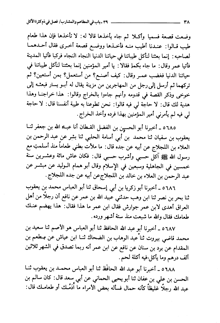 5686 - أخبرنا أبو زكريا بن أبي إسحاق ثنا أبو العباس محمد بن يعقوب ثنا بحر بن نصر ثنا ابن وهب حدثني عبيد الله بن عمر عن نافع : أن رجلا من أهل العراق أهدى لابن عمر جوارش فقال ابن عمر ما هذا فقال : هذا يهضم عنك طعامك فقال والله ما شبعت منذ ستة أشهر ورده