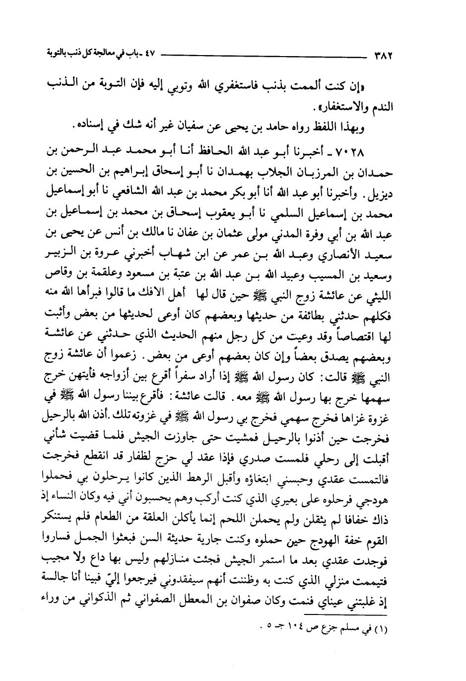 7028 - أخبرنا أبو عبد الله الحافظ أنا أبو محمد عبد الرحمن بن حمدان بن المرزبان الجلاد بهمدان نا أبو إسحاق إبراهيم بن الحسين بن ديزيل وأخبرنا أبو عبد الله أنا أبو بكر محمد بن عبد الله الشافعي نا أبو إسماعيل محمد بن إسماعيل السلمي نا أبو يعقوب إسحاق بن محمد بن إسماعيل بن عبد الله بن أبي وفرة المدني مولى عثمان بن عفان نا مالك بن أنس عن يحيى بن سعيد الأنصاري و عبد الله بن عمر عن ابن شهاب أخبرني عروة بن الزبير و سعيد بن المسيب و عبيد الله بن عبد الله بن عتبة بن مسعود و علقمة بن وقاص الليثي عن عائشة زوج النبي صلى الله عليه و سلم : حين قال لها أهل الافك ما قالوا فبرأها الله منه فكلهم حدثني بطائفة من حديثها وبعضهم كان أوعى لحديثها من بعض وأثبت لها اقتصاصا وقد وعيت من كل رجل منهم حديث الذي حدثني عن عائشة وبعضهم يصدق بعضا وإن كان بعضهم أوعى من بعض زعموا أن عائشة زوج النبي صلى الله عليه و سلم قالت : كان رسول الله صلى الله عليه و سلم إذا أراد سفرا أقرع بين أزواجه فأيتهن خرج سهما خرج بها رسول الله صلى الله عليه و سلم معه قالت عائشة : فأقرع بيننا رسول الله صلى الله عليه و سلم في غزوة غزاها فخرج سهمي فخرج بي رسول الله صلى الله عليه و سلم في غزوته تلك أذن الله بالرحيل فخرجت حين أذنوا بالرحيل فمشت حتى جاوزت الجيش فلما قضيت شأني أقبلت إلى رحلي فلمست صدري فإذا عقد لي خرج لظفار قد انقطع فخرجت فالتمست عقدي وحبسني ابتغاؤه وأقبل الرهط الذين كانوا يرحلون بي فحملوا هودجي فرحلوه على بعيري الذي كنت أركب وهم يحسبون أني فيه وكان النساء إذ ذاك خفافا لم يثقلن ولم يحملن اللحم إنما يأكلن العلقة من الطعام فلم يستنكر القوم خفة الهودج حين حملوه وكنت جارية حديثة السن فبعثوا الجمل فساروا فوجدت عقدي بعدما استمر الجيش فجئت منازلهم ليس بها داع ولا مجيب فتيممت منزلي الذي كنت به وظننت أنهم سيفقدوني فيرجعوا إلي فبينا أنا جالسة إذ غلبتني عيناي فنمت وكان صفوان بن المعطل الصفواني ثم الذكواني من وراء الجيش فأدلج فأصبح عند منزلي فرأى سواد إنسان نائم فعرفني حين رآني قبل الحجاب فاستيقظت باسترجاعه حين عرفني فخمرت وجهي بجلبابي و والله ما كلمته كلمة ولا سمعت منه كلمة غير استرجاعه حين عرفني أناخ راحلته ووطئ على يدها فركبتها وانطلق يقود بي الراحلة حتى أتينا الجيش بعدما نزلوا معرسين في نحر الظهيرة وملك في من هلك وكان الذي تولى كبر الإفك عبد الله بن أبي سلول فقدمنا المدينة فشكيت شهرا والناس يفيضون في قول أصحاب الإفك وأنا لا أشعر بالشيء حتى نقهت فخرجت أنا و أم مسطح قبل المناصع وكان متبرزنا لا نخرج إليها إلا ليلا إلى ليل وذلك قبل أن نتخذ الكنف قريبا من بيوتنا وإنما أمرنا أمر العرب الأول في البرية قبل الغائط وكنا نتأذى بالكنف أن نتخذها عند بيوتنا فأقبلت أنا و أم مسطح قيل يعني حين فرغنا من شأننا و أم مسطح وهي ابنة أبي إبراهيم بن المطلب بن عبد مناف وأمها بنت صخر بن عامر خالة أبي بكر الصديق وابنها مسطح بن أثاثة بن عباد بن عبد المطلب فعثرت أم مسطح في مرطها فقالت : تعس مسطح فقلت لها : بئس ما قلت وماذا قال : فأخبرتني بقول أهل الإفك فازددت مرضا على مرضي فلما دخل علي رسول الله صلى الله عليه و سلم قال : كيف تيكم ؟ فقلت : أتأذن لي أن آتي أبوي ؟ وأنا حينئذ أريد أن أستيقن الخبر من قبلهما فأذن لي رسول الله صلى الله عليه و سلم فأتيت أبوي فقلت لأمي : يا أمتاه ما يتحدث به الناس ؟ فقالت : يا بنيه هوني عليك هذا الشأن فوالله لقلما كانت امرأة وضيئة عند رجل يحبها ولا ضرائر إلا أكثرن عليها فقلت سبحان الله ولقد تحدث الناس بها قالت : فبكيت تلك الليلة حتى أصبحت ثم أصبحت ودعا رسول الله صلى الله عليه و سلم علي بن أبي طالب و أسامة بن زيد حين استلبث الوحي يستشيرهما في فراق أهله فأما أسامة فإنه أشار على رسول الله صلى الله عليه و سلم بالذي يعلم من براءة أهله وبالذي يعلم من الود لهم قال : يا رسول الله أهلك ولا نعلم إلا خيرا وأما علي فقال : يا رسول الله لم يضيق الله عليك والنساء بكثير