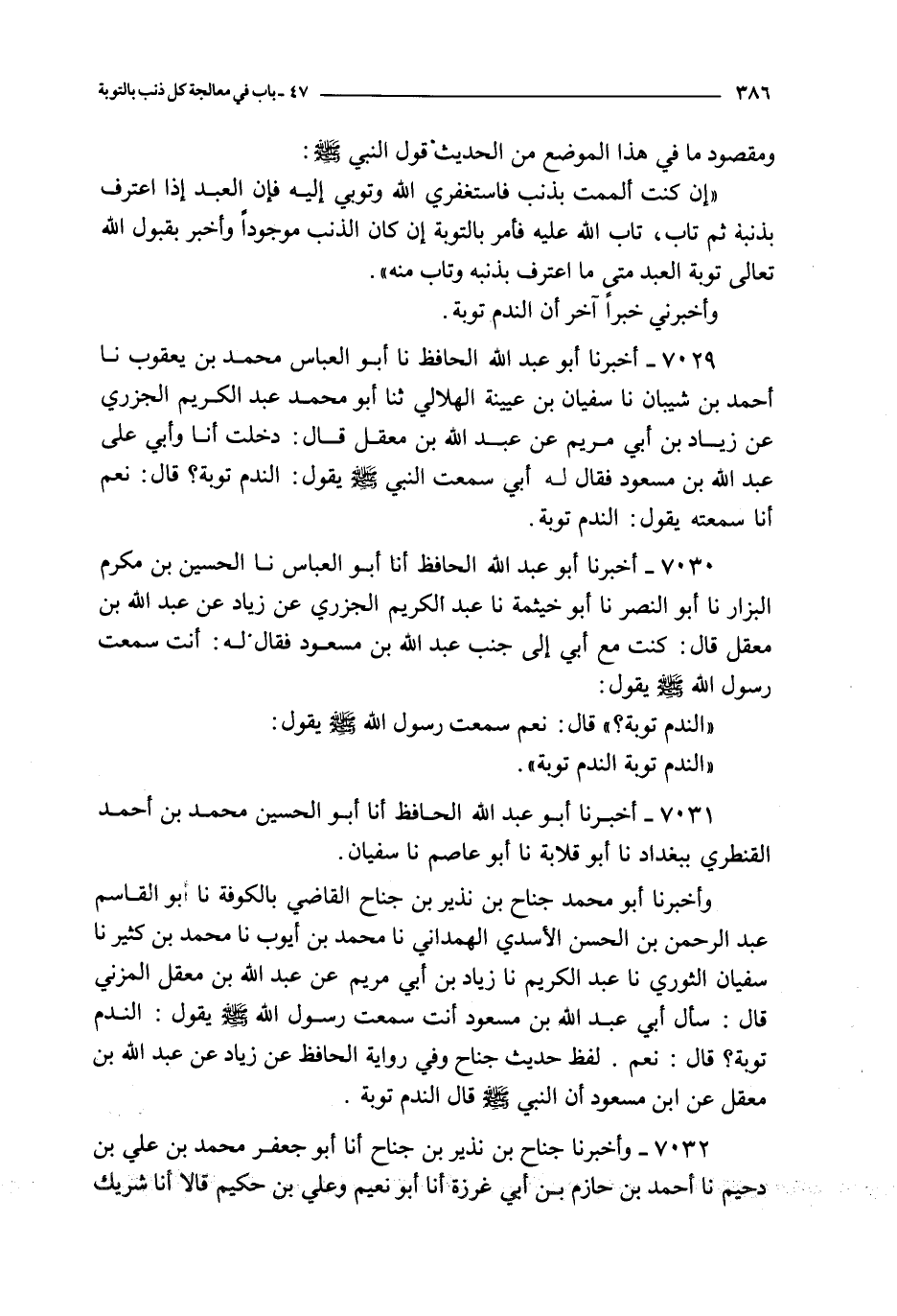 7032 - و أخبرنا جناح بن نذير بن جناح أنا أبو جعفر محمد بن علي بن دحيم نا أحمد بن حازم بن أبي غزرة أنا أبو نعيم و علي بن حكيم قالا أنا شريك عن عبد الكريم عن زياد بن الجراح عن عبد الله بن معقل قال : دخلت مع أبي على عبد الله بن مسعود فسمعته يقول : سمعت رسول الله صلى الله عليه و سلم يقول : الندم توبة