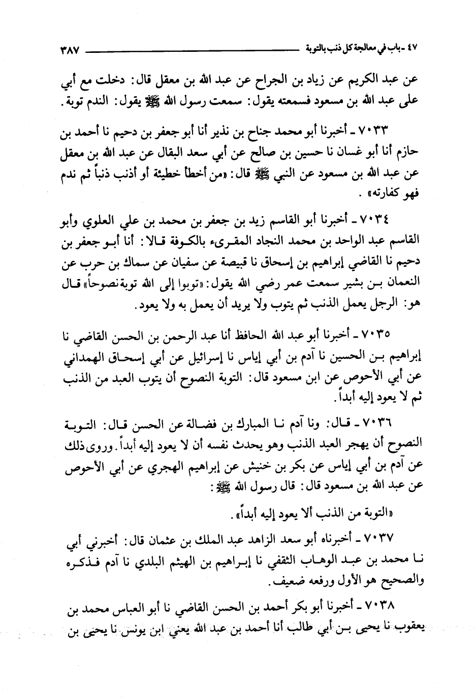 7035 - أخبرنا أبو عبد الله الحافظ أنا عبد الرحمن بن الحسن القاضي نا إبراهيم بن الحسين نا آدم بن أبي إياس نا إسرائيل عن أبي إسحاق الهمداني عن أبي الأحوص عن ابن مسعود قال : التوبة النصوح أن يتوب العبد من الذنب ثم لا يعود إليه أبدا