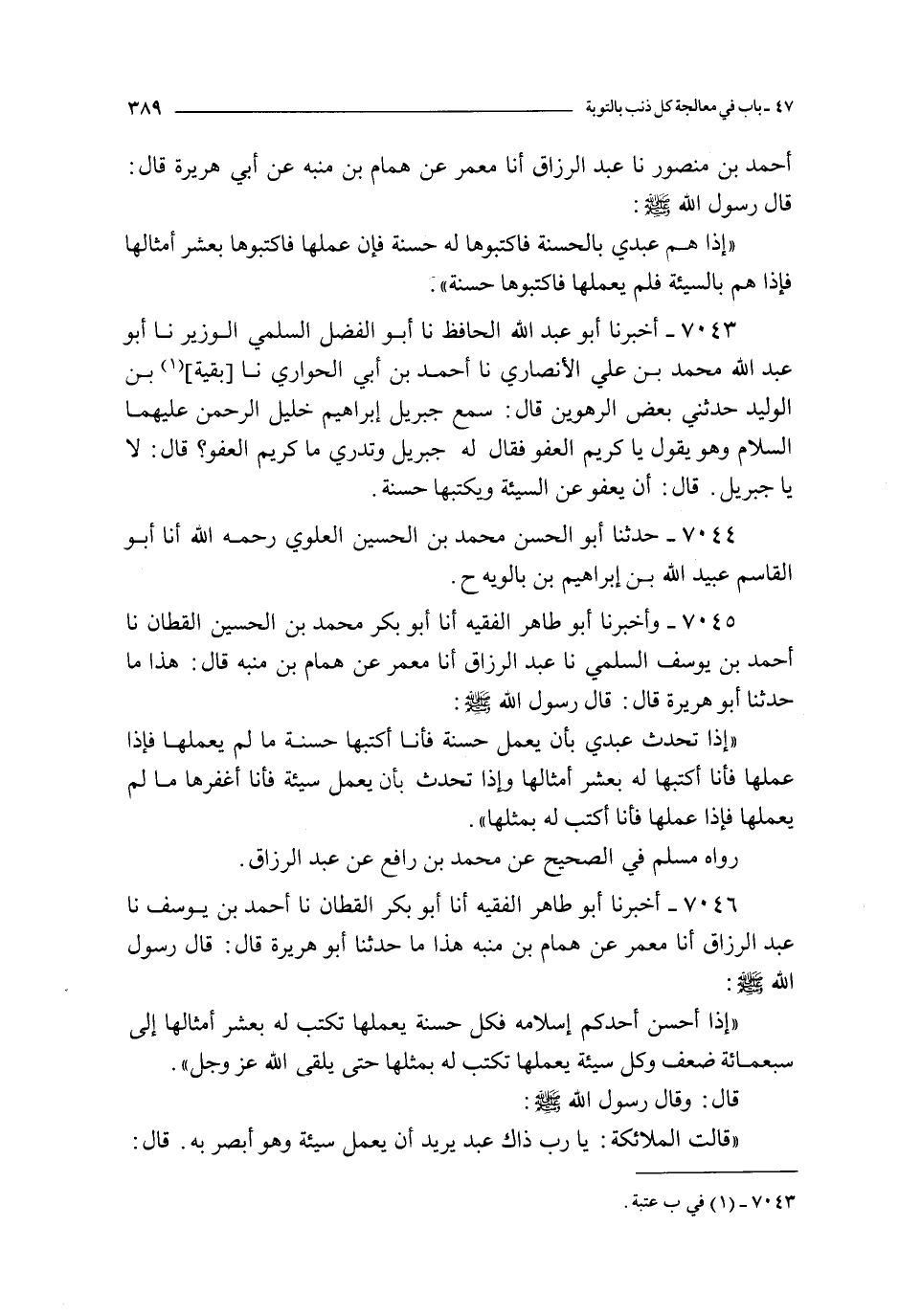 7046 - أخبرنا أبو طاهر الفقيه أنا أبو بكر القطان نا أحمد بن يوسف نا عبد الرزاق أنا معمر عن همام بن منبه : هذا ما حدثنا أبو هريرة قال : قال رسول الله صلى الله عليه و سلم :