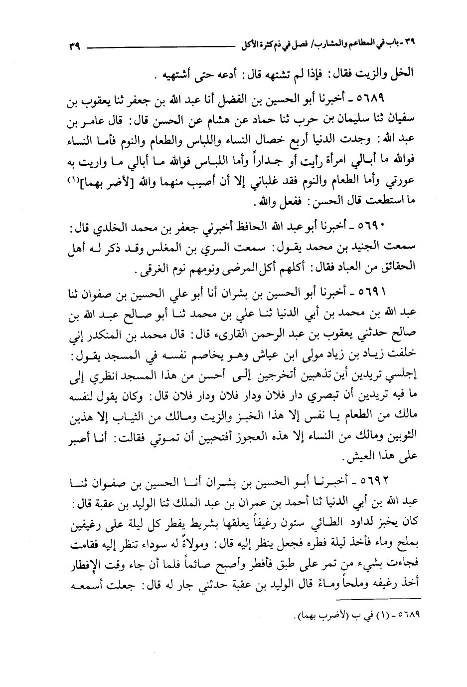 5689 - أخبرنا أبو الحسين بن الفضل أنا عبد الله بن جعفر ثنا يعقوب بن سفيان ثنا سليمان بن حرب ثنا حماد عن هشام عن الحسن قال : قال عامر بن عبد الله : وجدت الدنيا أربع خصال النساء واللباس والطعام والنوم فأما النساء فو الله ما أبالي امرأة رأيت أو جدارا وأما اللباس فو الله ما أبالي ما واريت به عورتي وأما الطعام والنوم فقد غلباني إلا أن أصيب منهما والله لأضربهما ما استطعت قال الحسن : ففعل والله