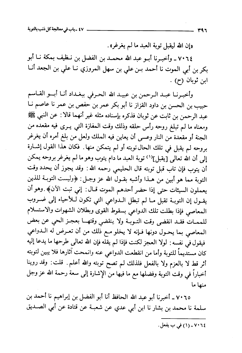 وأخبرنا عبد الرحمن بن عبيد الله الحرفي ببغداد أنا أبو القاسم حبيب بن الحسن بن داود القزاز نا أبو بكر عمر بن حفص بن عمر نا عاصم نا عبد الرحمن بن ثابت عن ثوبان : فذكره بإسناده مثله غير أنهما قالا : عن النبي صلى الله عليه و سلم ومعناه ما لم تبلغ روحه رأس حلقه و ذلك وقت المفازة التي يرى فيه مقعده من الجنة أو مقعدة من النار وعسى أن يعاين فيه الملك ولعل من بلغ أمره أن يغرغر بروحه لم يقبل في تلك الحال توبته أو لم يتمكن منها فكان هذا القول إشارة إلى أن الله يقبل توبة العبد ما دام يتوب وهو ما لم يغرغر بروحه يمكن أن يتوب فإن تاب قبل توبته قال الحليمي رحمه الله : وقد يجوز أن يحدد وقت التوبة مما هو أبين من هذا وأشبه بقول الله عز و جل : { وليست التوبة للذين يعملون السيئات حتى إذا حضر أحدهم الموت قال إني تبت الآن } وهو أن يقول إن التوبة تقبل ما لم تبطل الدعاوي التي تكون للأحياء إلى ضروب المعاصي فإذا بطلت تلك الدواعي بسقوط القوى وبطلان الشهوات والاستسلام للممات فقد انقضى وقت التوبة ولا ينقضي وقتها بعجز الحي عن بعض المعاصي بما يحول دونها فإنه لا يخلوا مع ذلك من أن تعرض له الدواعي فيقول في نفسه : لو لا العجز لكنت فإذا لم يقله فإن الله تعالى طرحها ما يدعا إليه كان مستديما للتوبة وأما انقطعت الدواعي عنه وانمحت آثارها فلا يبين لتوبته أثر قط لا بالعزم ولا بالفعل فلذلك لم تصح توبته والله أعلم قلت : وقد روينا أخبارا في وقت التوبة وفضلها مع ما فيها من الإشارة إلى سعة رحمة الله عز و جل منها ما