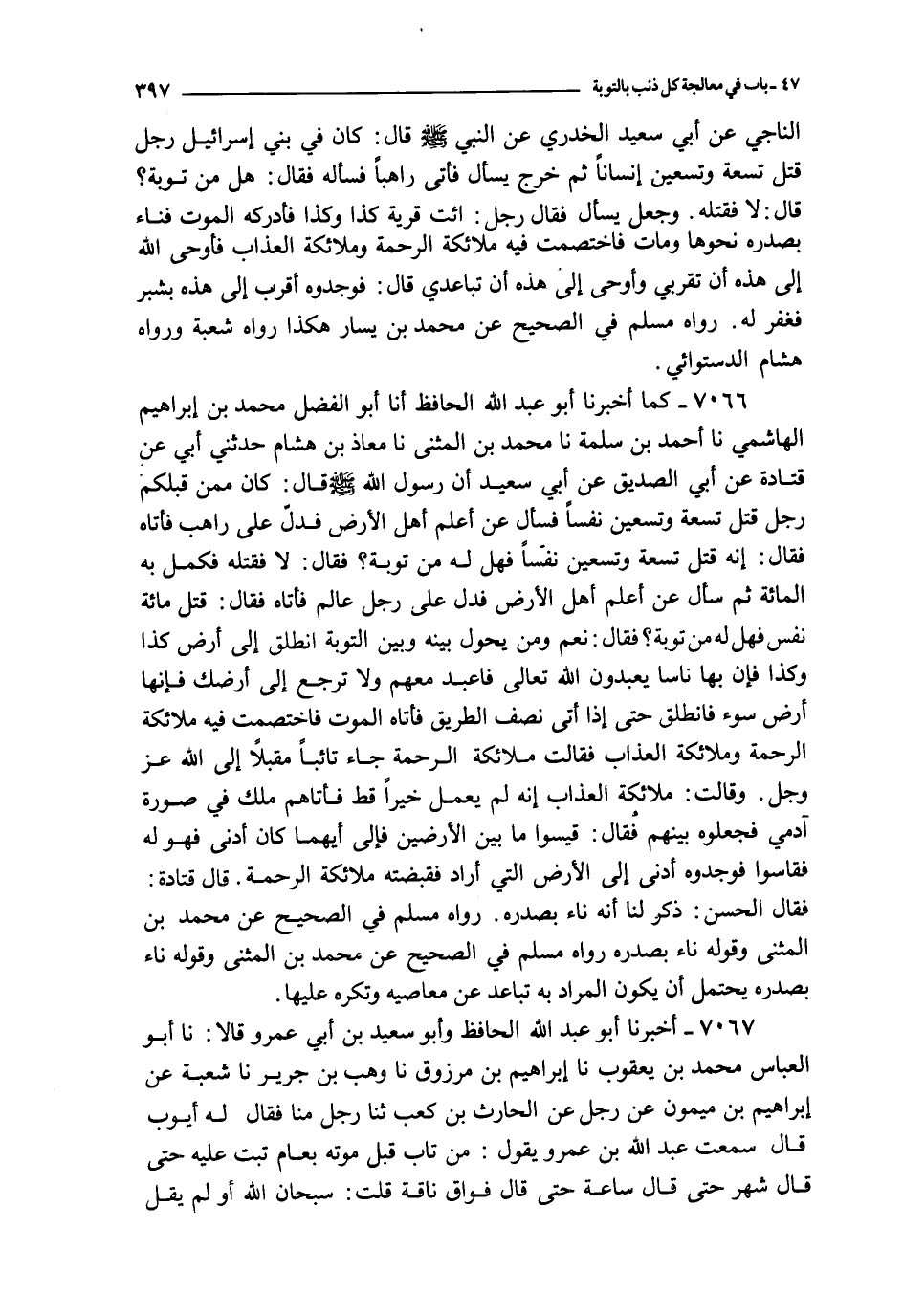 7066 - كما أخبرنا أبو عبد الله الحافظ أنا أبو الفضل محمد بن إبراهيم الهاشمي نا أحمد بن سلمة نا محمد بن المثنى نا معاذ بن هشام حدثني أبي عن قتادة عن أبي الصديق عن أبي سعيد : أن رسول الله صلى الله عليه و سلم قال : كان ممن قبلكم رجل قتل تسعة وتسعين نفسا فسأل عن أعلم أهل الأرض فدل على راهب فأته فقال : إنه قتل تسعة وتسعين نفسا فهل له من توبة ؟ فقال : لا فقتلته فكمل به المائة ثم سأل عن أعلم أهل الأرض فدل على رجل عالم فأتاه فقال : قتل مائة نفس فهل له من توبة ؟ فقال : نعم ومن يحول بينه وبين التوبة انطلق إلى أرض كذا وكذا فإن بها ناسا يعبدون الله تعلى فاعبد معهم ولا ترجع إلى أرضك فإنها أرض سوء فانطلق حتى إذا أتى نصف الطريق فأتاه الموت فاختصمت فيه ملائكة الرحمة وملائكة العذاب فقالت ملائكة الرحمة جاء تائبا مقبلا إلى الله عز و جل وقالت : ملائكة العذاب إنه لم يعمل خيرا قط فأتاهم ملك في صورة آدم فجعلوه بينهم فقال : قيسوا ما بين الأرضين فإلى أيهما كان أدنى فهو له فقاسوا فوجدوه بينهم أدنى إلى الأرض التي أراد فقبضته ملائكة الرحمة قال قتادة فقال الحسن : ذكر لنا أنه ناء بصدره ورواه مسلم في الصحيح عن محمد بن المثنى وقوله ناء بصدره يحتمل أن يكون مراد به تباعد عن معاصيه وتكره عليها