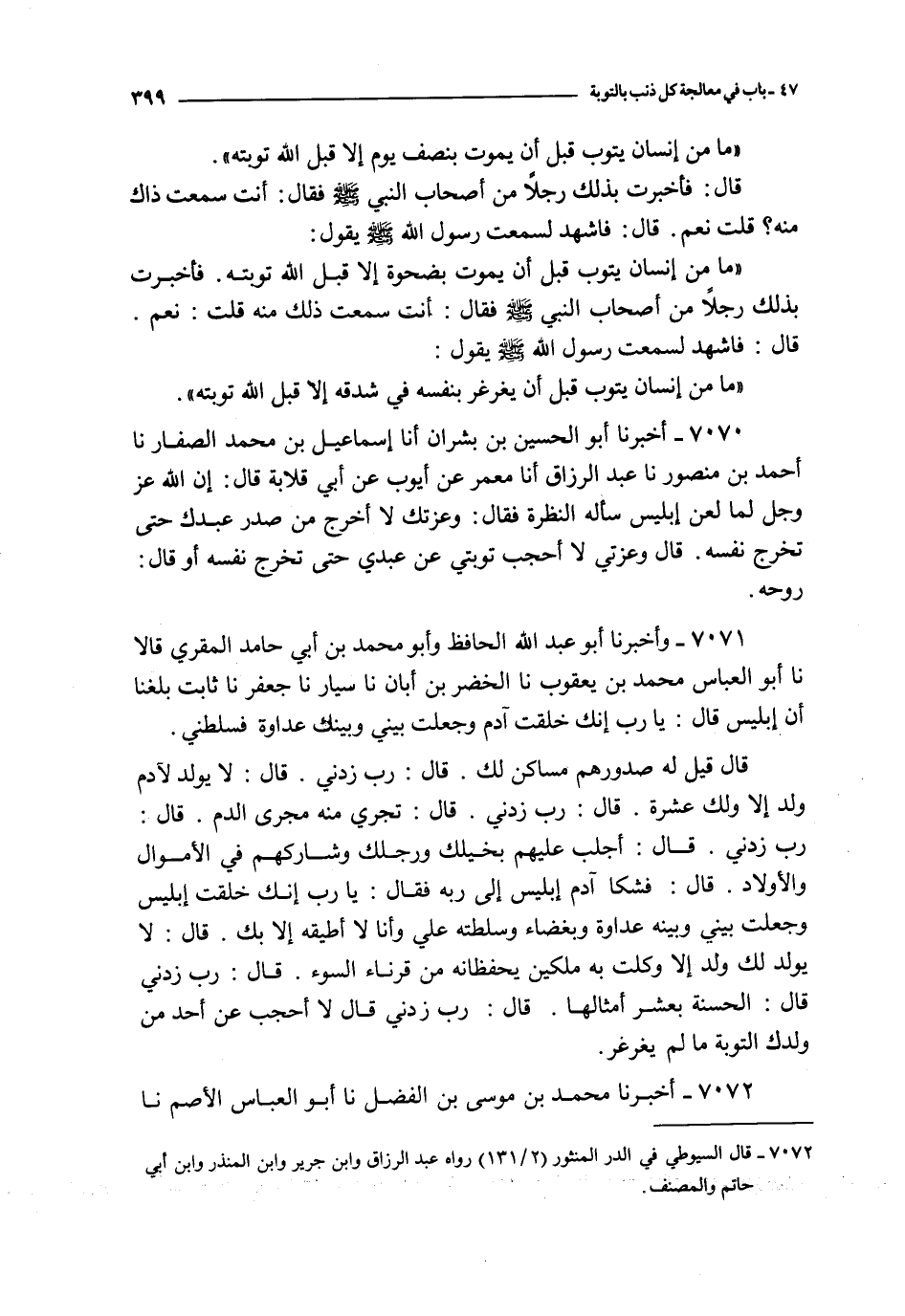 7070 - أخبرنا أبو الحسين بن بشران أنا إسماعيل بن محمد الصفار نا أحمد بن منصور نا عبد الرزاق أنا معمر عن أيوب عن أبي قلابة قال : إن الله عز و جل لما لعن إبليس سأله النظرة فقال : وعزتك لا أخرج من صدر عبدك حتى تخرج نفسه قال وعزتي لا أحجب توبتي عن عبدي حتى تخرج نفسه أو قال : روحه