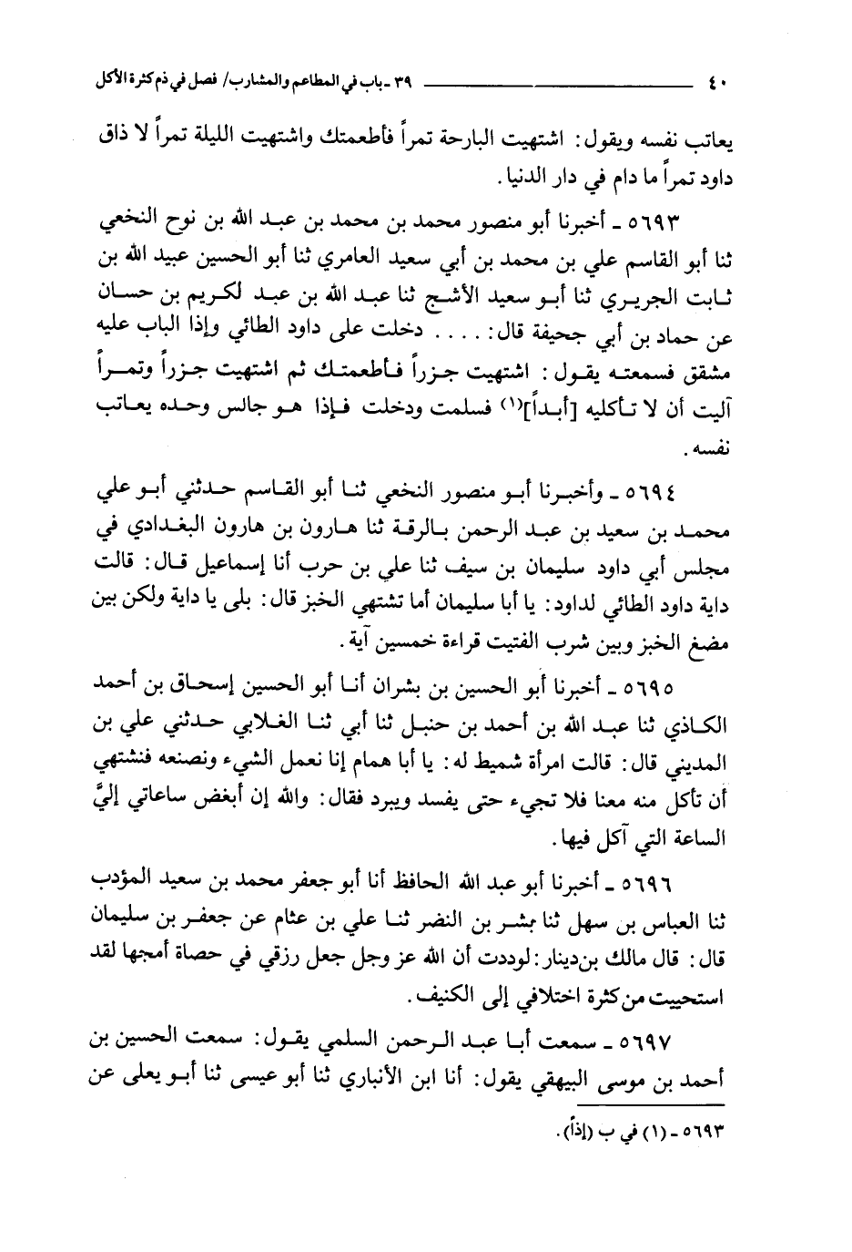 5693 - أخبرنا أبو منصور محمد بن محمد بن عبد الله بن نوح النخعي ثنا أبو القاسم علي بن محمد بن أبي سعيد العامري ثنا أبو الحسين عبيد الله بن ثابت الجريري ثنا أبو سعيد الأشج ثنا عبد الله بن عبد الكريم بن حسان عن حماد بن أبي جحيفة قال : دخلت على داود الطائي وإذا الباب عنه مشقق فسمعته يقول : اشتهيت جزرا فأطعمتك ثم اشتهيت جزرا وتمرا آليت أن لا تأكليه أبدا فسلمت ودخلت فإذا هو جالس وحده يعاتب نفسه