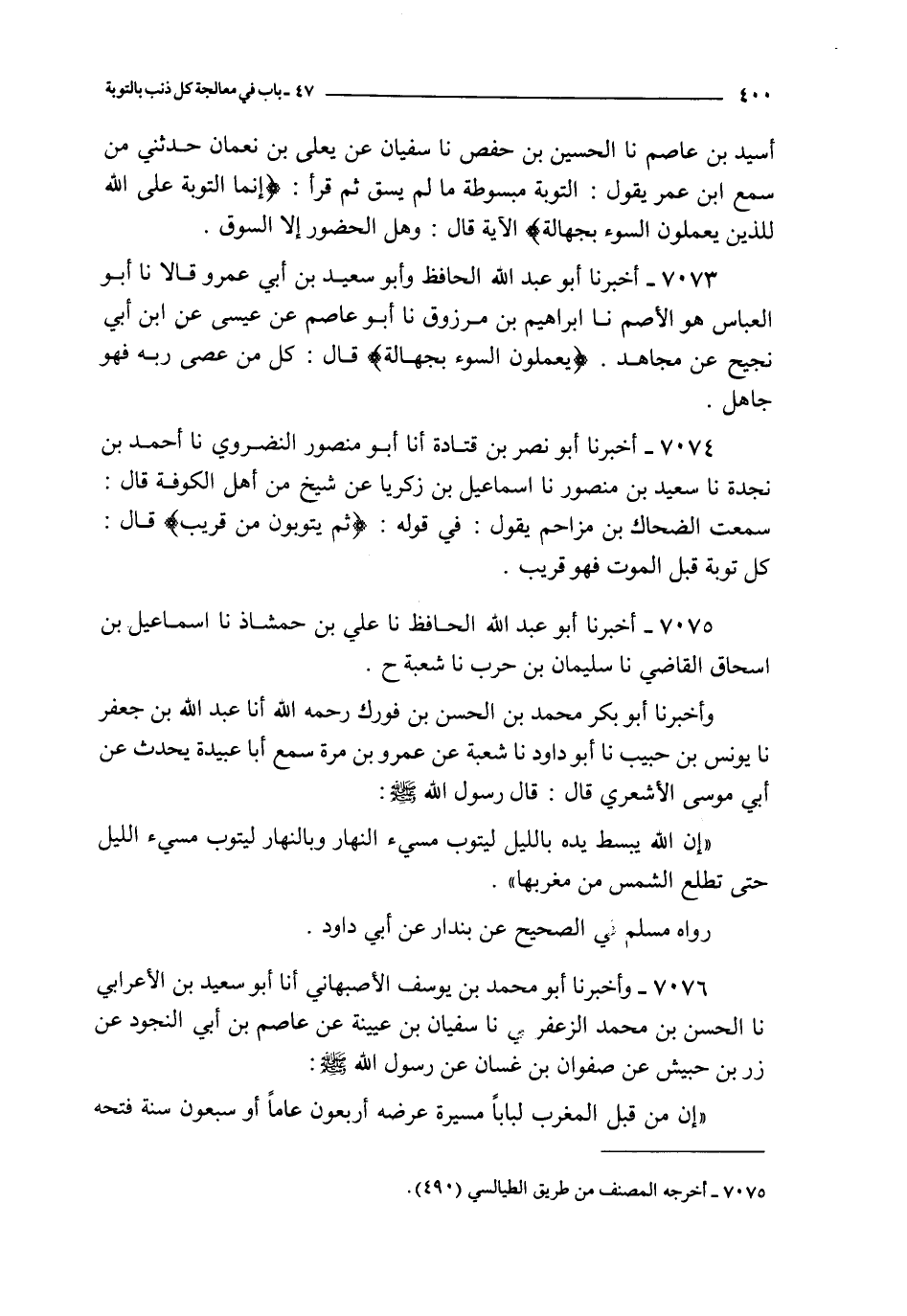 7073 - أخبرنا أبو عبد الله الحافظ و أبو سعيد بن أبي عمرو نا أبو العباس الأصم نا إبراهيم بن مرزوق نا أبو عاصم عن عيسى عن ابن أبي نجيح عن مجاهد : ـ { يعملون السوء بجهالة } قال : كل من عصى ربه فهو جاهل