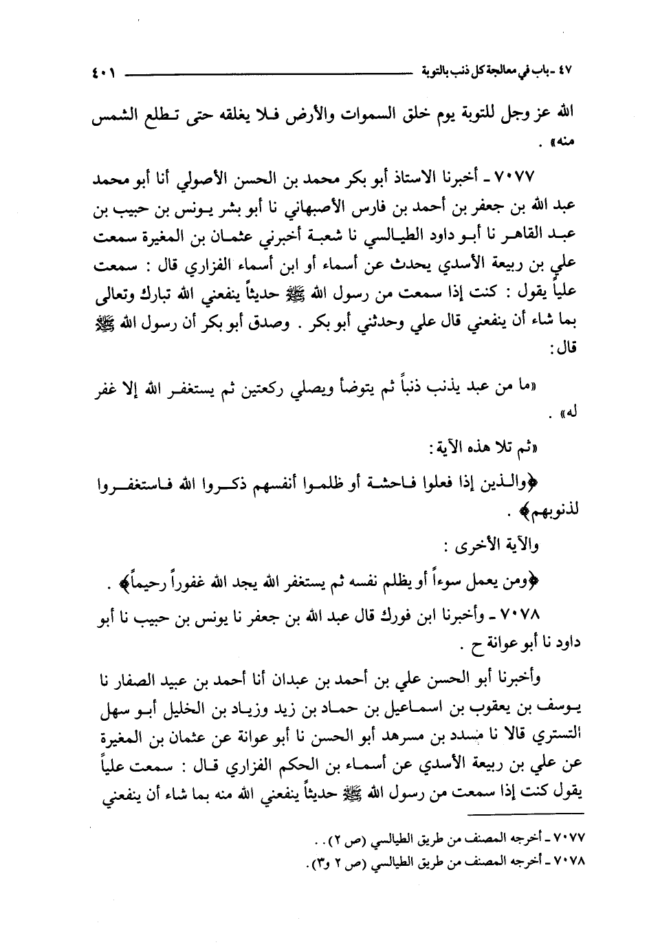 7078 - و أخبرنا ابن فورك قال عبد الله بن جعفر نا يونس بن حبيب نا أبو داود نا أبو عوانة ح