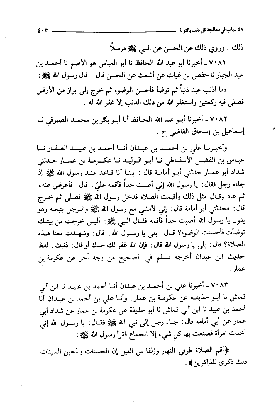 وأخبرنا علي بن أحمد بن عبدان أنا أحمد بن عبيد الصفار نا عباس بن الفضل الأسفاطي نا أبو الوليد نا عكرمة بن عمار حدثني شداد أبو عمار حدثني أبو أمامة قال : بينا أنا قاعد عند رسول الله صلى الله عليه و سلم إذا جاءه رجل فقال : يا رسول الله إني أصبت حدا فأقمته علي قال : فأعرض عنه ثم عاد وقال مثل ذلك وأقيمت الصلاة فدخل رسول الله صلى الله عليه و سلم فصلى ثم خرج قال : فحدثني أبو أمامة قال : إني لأمشي مع رسول الله صلى الله عليه و سلم والرجل يتبعه وهو يقول يا رسول الله أصبت حدا فأقمه فقال النبي صلى الله عليه و سلم : أليس خرجت من بيتك توضأت فأحسنت الوضوء ؟ قال : بلى يا رسول الله قال : وشهدت معنا هذه الصلاة ؟ قال : بلى يا رسول الله قال : فإن الله غفر لك حدك أو قال : ذنبك لفظ حديث ابن عبدان أخرجه مسلم في الصحيح من وجه آخر عن عكرمة بن عمار