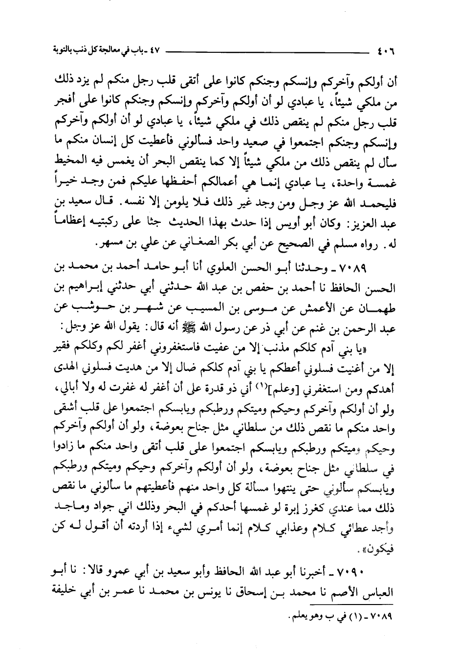 يا بني آدم كلكم مذنب إلا من عفيت فاستغفروني أغفر لكم وكلكم فقير إلا من أغنيت فسلوني أعطكم يا نبي آدم كلكم ضال إلا من هديت فسلوني الهدى أهدكم ومن استغفرني وعلم أني ذو قدرة على أن أغفر له غفرت له ولا أبالي ولو أن أولكم وآخركم وحيكم وميتكم ورطبكم ويابسكم اجتمعوا على قلب أشقى واحد منكم ما نقص ذلك من سلطاني مثل جناح بعوضة ولو أن أولكم وآخركم وحيكم وميتكم ورطبكم ويابسكم اجتمعوا على قلب أتقى واحد منكم ما زادوا في سلطاني مثل جناح بعوضة ولو أن أولكم و آخركم و حيكم و ميتكم و رطبكم و يابسكم سألوني حتى ينتهوا مسألة كل واحد منهم فأعطيتهم ما سألوني ما نقص ذلك مما عندي كغرز غبرة لو غمسها أحدكم في البحر وذلك أني جواد وماجد وأجد عطائي كلام وعذابي كلام إنما أمري لشيء إذا أردته أن أقول له كن فيكون