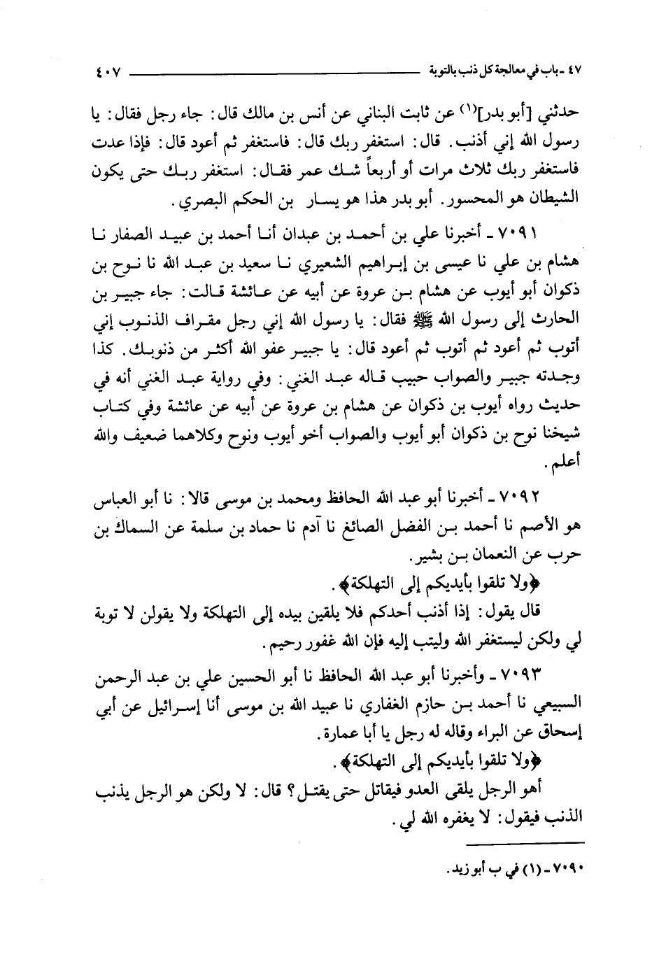 7091 - أخبرنا علي بن أحمد بن عبدان أنا أحمد بن عبيد الصفار نا هشام بن علي نا عيسى بن إبراهيم الشعيري نا سعيد بن عبد الله نا نوج بن ذكوان أبو أيوب عن هشام بن عروة عن أبيه عن عائشة قالت : جاء جبير بن الحارث إلى رسول الله صلى الله عليه و سلم فقال : يا رسول الله إني رجل مقراف الذنوب إني أتوب ثم أعود ثم أتوب ثم أعود قال : يا جبير عفو الله أكثر من ذنوبك كذا وجدته جبير والصواب حبيب قاله عبد الغني : وفي رواية عبد الغني أنه في حديث رواه أيوب بن ذكوان عن هشام بن عروة عن أبيه عن عائشة وفي كتاب شيخنا نوح بن ذكوان أبو أيوب والصواب أخو أيوب و نوح وكلاهما ضعيف والله أعلم