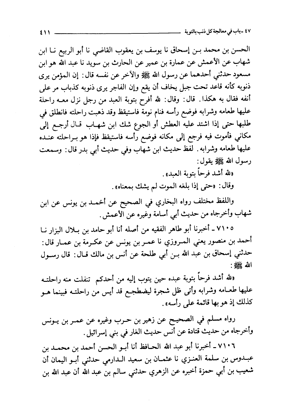 7105 - أخبرنا أبو طاهر الفقيه من أصله أنا أبو حامد بن بلال البزاز نا أحمد بن منصور يعني المروزي نا عمر بن يونس عن عكرمة بن عمار قال : حدثني إسحاق بن عبد الله بن أبي طلحة عن أنس بن مالك قال : قال رسول الله صلى الله عليه و سلم :