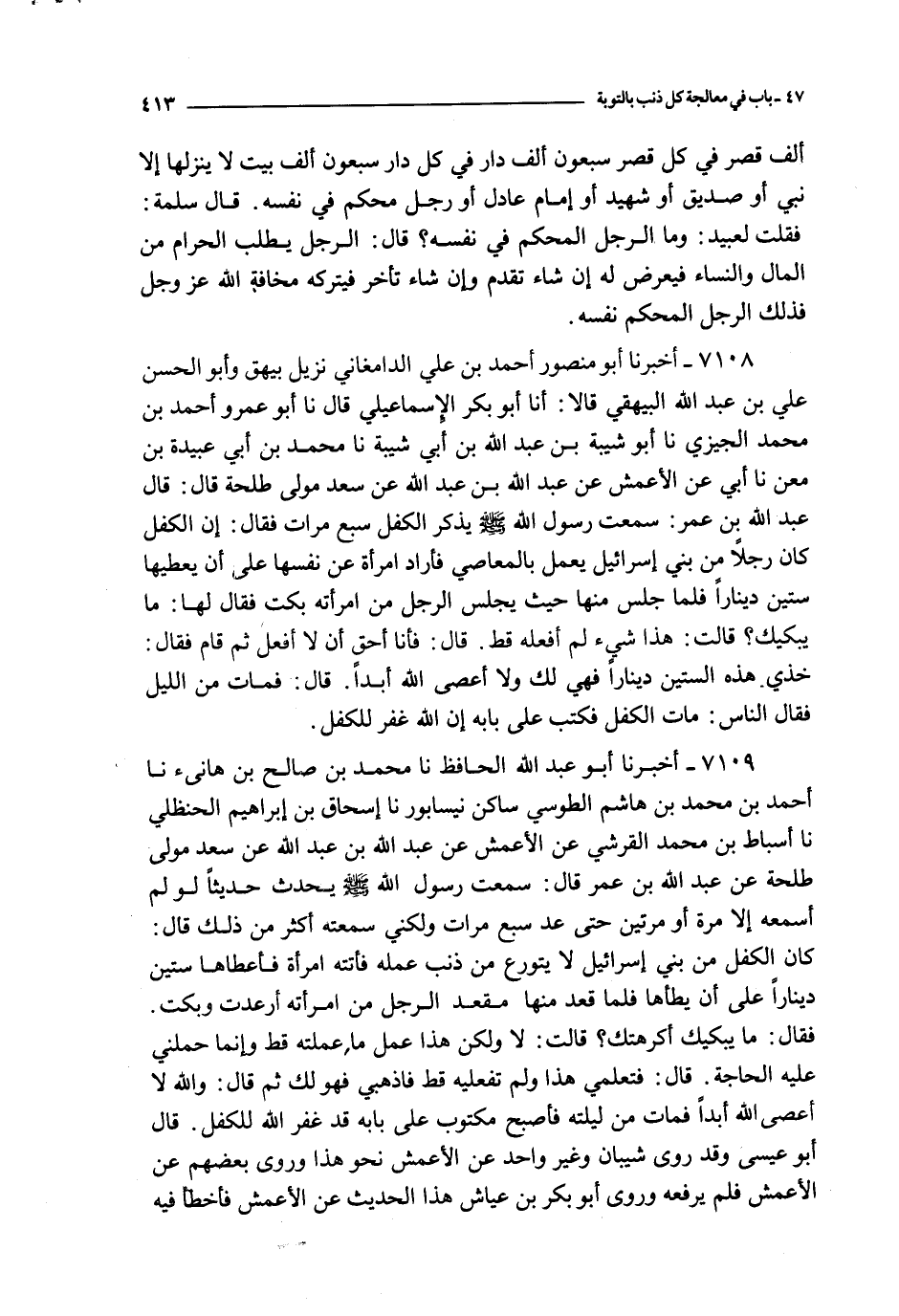 7109 - أخبرنا أبو عبد الله الحافظ نا محمد بن صالح بن هانئ نا أحمد بن محمد بن هاشم الطوسي ساكن نيسابور نا إسحاق بن إبراهيم الحنظلي نا أسباط بن محمد القرشي عن الأعمش عن عبد الله بن عبد الله عن سعد مولى طلحة عن عبد الله بن عمر قال : سمعت رسول الله صلى الله عليه و سلم يحدث حديثا لو لم أسمعه إلا مرة أو مرتين حتى عد سبع مرات ولكني سمعته أكثر من ذلك قال : كان الكفل من بني إسرائيل لا يتورع من ذنب عمله فأتته امرأة فأعطاها ستين دينارا على أن يطأها فلما قعد منها مقعد الرجل من امرأته أرعدت وبكت فقال : ما يبكيك أكرهتك ؟ قالت : لا ولكن هذا عمل ما عملته قط وإنما حملني عليه الحاجة قال : فتعلمني هذا ولم تفعليه قط فاذهبي فهو لك ثم قال : والله لا أعصي الله أبدا فمات من ليلته فأصبح مكتوب على بابه قد غفر الله للكفل قال أبو عيسى وقد روي شيبان وغير واحد عن الأعمش نحو هذا وروى بعضهم عن الأعمش فلم يرفعه وروى أبو بكر بن عياش هذا الحديث عن الأعمش فأخطأ فيه وقال : عن عبد الله بن عبد الله عن سعيد بن جبير عن ابن عمر وهو غير محفوظ