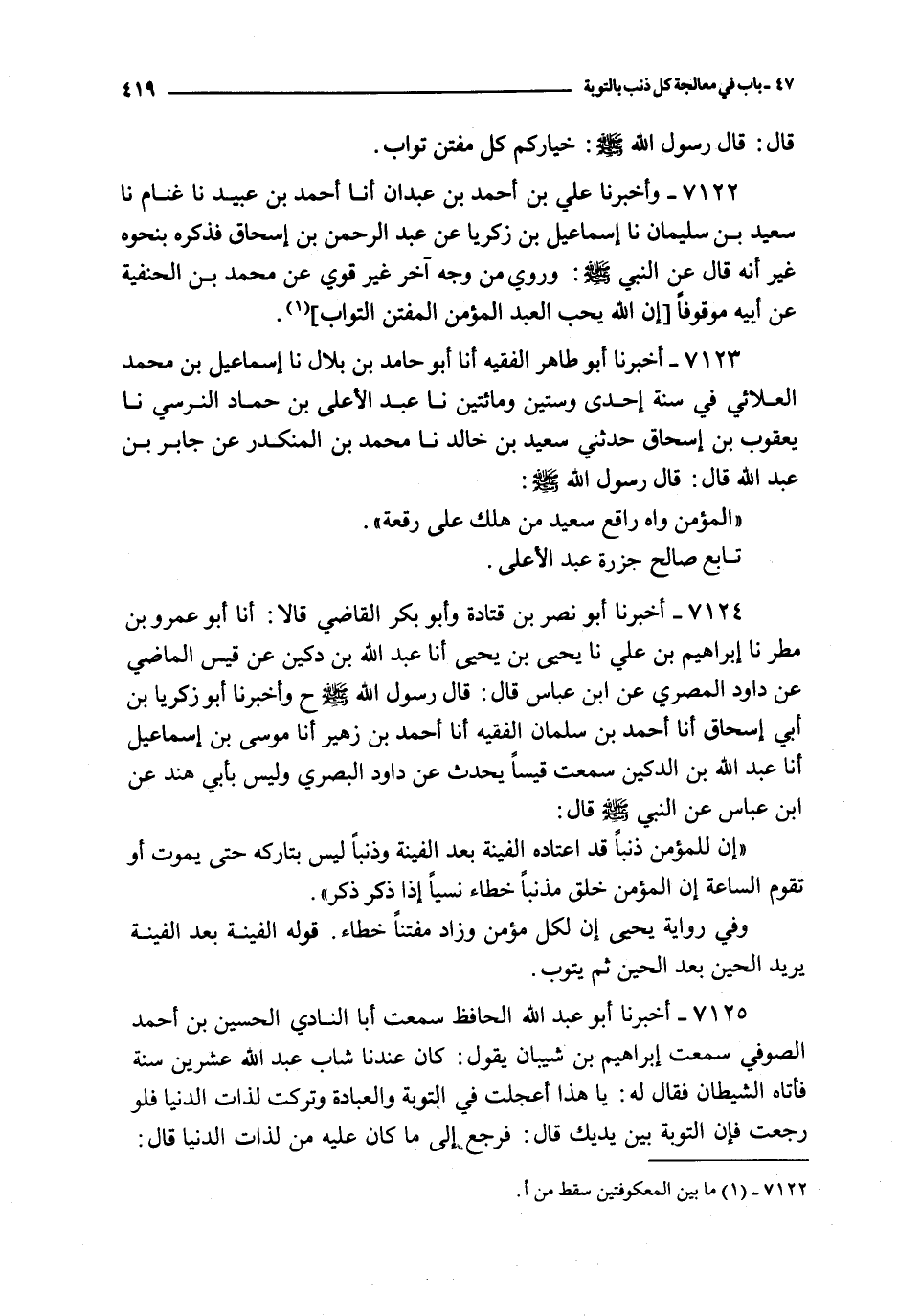 7122 - وأخبرنا علي بن أحمد بن عبدان أنا أحمد بن عبيد نا غنام نا سعيد بن سليمان نا إسماعيل بن زكريا عن عبد الرحمن بن إسحاق : فذكره بنحوه غير أنه قال عن النبي صلى الله عليه و سلم : وروي من وجه آخر غير قوي عن محمد بن الحنفية عن أبيه موقوفا إن الله يحب العبد المفتن التواب