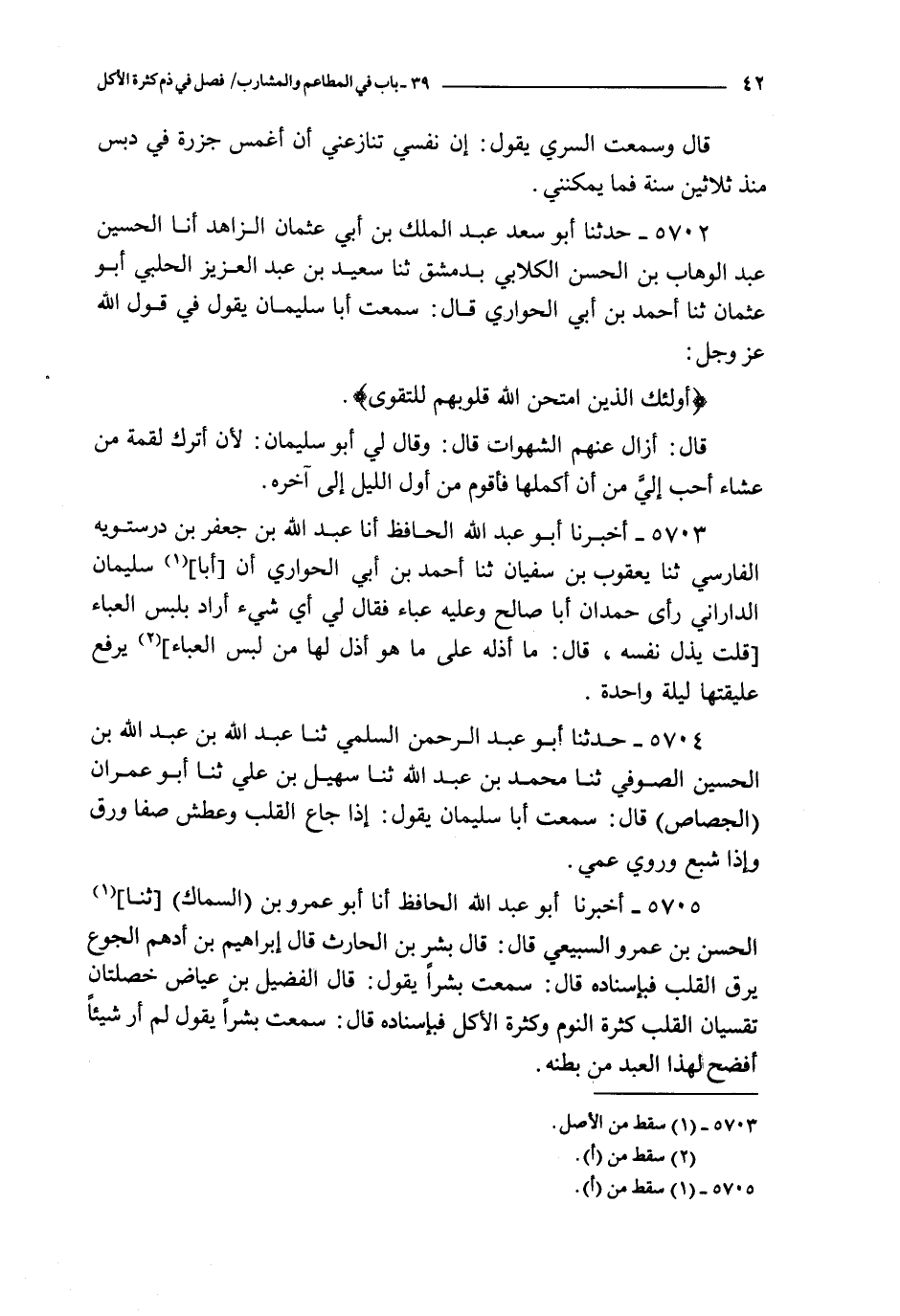 5703 - أخبرنا أبو عبد الله الحافظ أنا عبد الله بن جعفر بن درستويه الفارسي ثنا يعقوب بن سفيان ثنا أحمد بن أبي الحواري : أن أبا سليمان الداراني رأى حمدان أبا صالح وعليه عباء فقال لي أي شيء أراد بلبس العباء قلت يذل نفسه قال : ما أذله على ما هو أذل لها من لبس العباء يرفع عليقتها ليلة واحدة