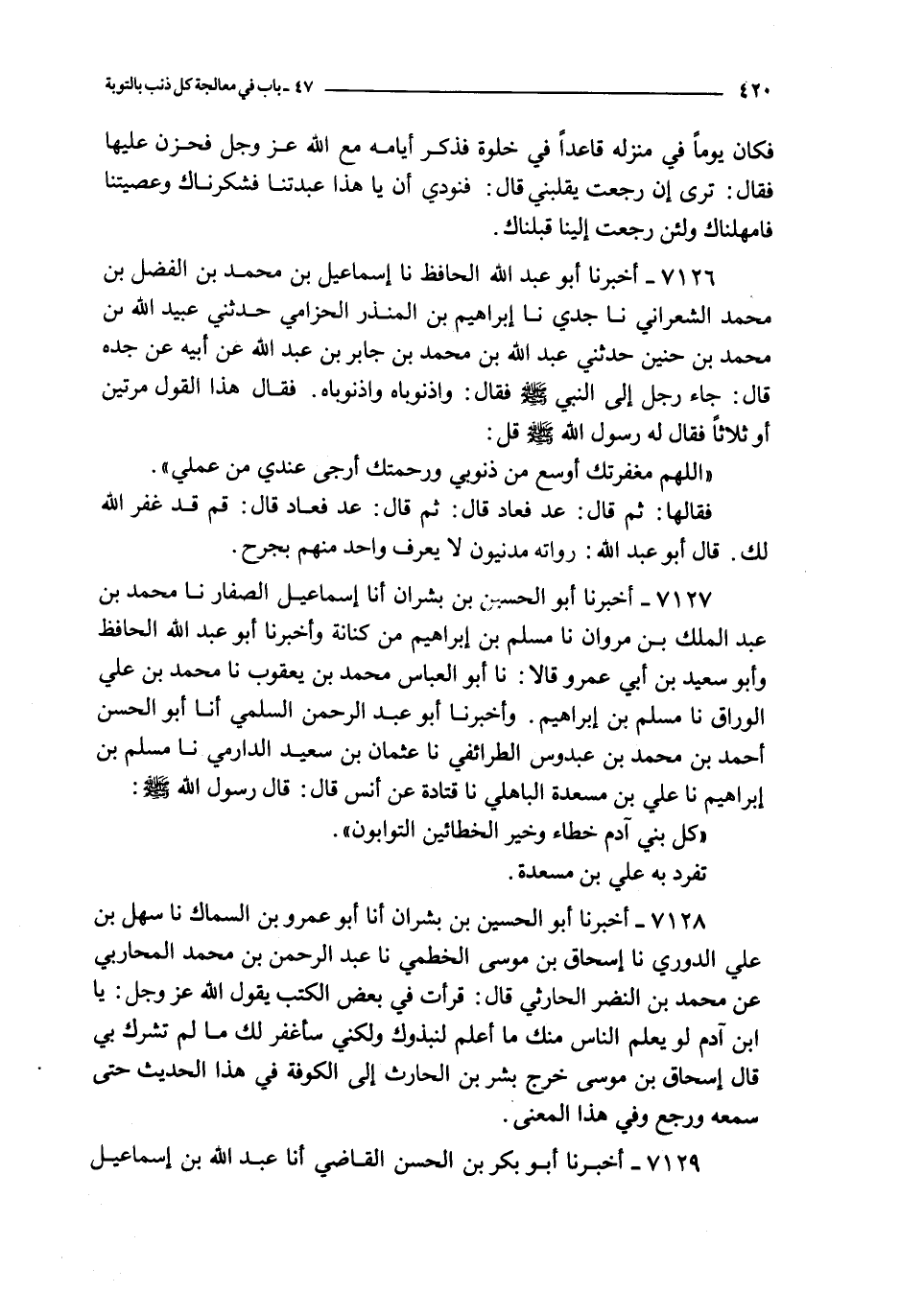 7126 - أخبرنا أبو عبد الله الحافظ نا إسماعيل بن محمد بن الفضل بن محمد الشعراني نا جدي نا إبراهيم بن المنذر الحزامي حدثني عبيد الله بن محمد بن حنين حدثني عبد الله بن محمد بن جابر بن عبد الله عن أبيه عن جده قال : جاء رجل إلى النبي صلى الله عليه و سلم فقال : واذنوباه واذنوباه فقال هذا القول مرتين أو ثلاثا فقال له رسول الله صلى الله عليه و سلم قل :